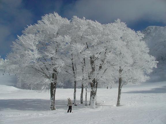 樹氷もすっかり、アラビン ドビン ハゲチャビンだ。え~と、先々週はブログで知り合った、はる☆さんと、ひろゆきさんと一緒に滑った。私は、ごく普通の人だし、ごく普通のスキーヤーなので、ごく普通に滑ってた。ふと左を見ると、ショートスキーのひろゆきさんが後ろ向きで私を追い越していく。「えっ?」右を見ると、はる☆さんはクルクル回ってる。「あんたは、遊園地のコーヒーカップか」な・なんなの、あなた達?そんな普通じゃない人達に挟まれた、ごく普通の私・・・ショーガナイから回ってみたさ(笑)あんまり緩斜面だと上手く回れない。かえって斜度がある方がやり易い。やってみると連続でクルクル回れる。2回3回・・・ほっほ~♪ 回る回る・・・5回6回クルクル、クルクル。・・・う、・・・頭がグワングワンしてきた。調子に乗って回りすぎた・・・頭がグラグラしてる。気持ち悪い・・・。やはり普通の人は、あまり回り過ぎないほうがイイのかも。頭が痛いのもすぐ直って、その後は普通に滑ってたんだけど何故かまた回りたくなった。だって、一緒にいる普通じゃない人達は相変わらず回ってるんだもの。今度は大丈夫な気がする。根拠はないけど。だって、一緒にいる普通じゃない人達は平気そうなんだもの。で、回ってみた。調子よく何度もクルクルと。・・・頭がグワ~ン、グワ~ン、やっぱダメだった。やらなきゃ良かった・・・。だいたいにして、私って、普段から学習ってことが出来ない。夏、カキ氷やアイスキャンディを食べると、頭がキーンと痛くなるよね。ゆっくり食べりゃいいんだけど、私はガツガツ食べるので毎回痛くなる。毎回必ずだ。ガリガリ君を食べてて、頭がキーンと痛くなる。「う~っ」とか言って頭を抱えて、うずくまっちゃう。やっと収まってきても、またガリガリ食べ始めて2度目の頭痛がやってくる・・・おバカだ。これは子供の頃だけじゃなくて、現在でもだ。・・・情けない。・・・なんて、アイスのことは、まぁどうでもよく、話をスキーに戻して。回りすぎて頭がグラグラしてる状態だ。学習能力がない私でも、揺れる頭の中で精一杯考えてみた。左回りでグラグラしたのなら、右に回れば元に戻るんではないか?(何を考えたのかと思えば、こんなくだらないことを・・・)いやいや、ものは試しだ。逆に回ってみた。クルクルクル・・・。あれ? ・・・直った。いや、冗談ではなく、ホントに直ったのだ。たぶん、これを読んでる人の半分は「ドジボったら、ま~た」なんて思って信じてないんだろうけど笑い話のようなホントの話なのだ。人間の体って精巧なのか単純なのかどっちにしろ面白いと感じたヒトコマだったのだ。あ、ところで、アイスを食べて頭が痛くなるのは頭の中の温度と、冷たくなった口の中の温度差が原因らしい。だから、頭が痛くなったら、口を大きく開けて暖かい外気を入れて口の中の温度を上げると直るのだ。これは、私が実証済み。でも、その後でまた急いで食べると、また痛くなるからね。気をつけて。ウチの冷凍庫には年中アイスが入ってるのだ。「あ、ウチも」って人はクリックして・・・そんな人いないか?