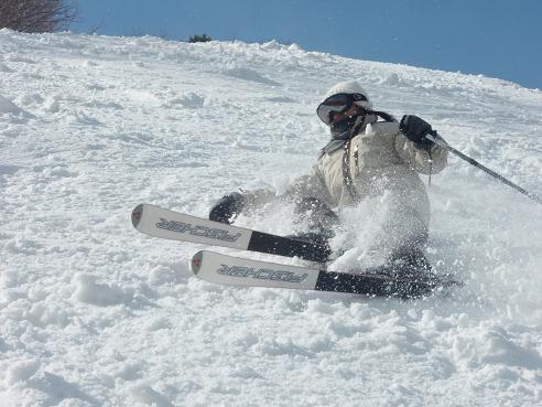 ニョーボは緩斜面を滑らせたら、おそらく、日本一・・・・・やる気なさそうに滑ってるだろう(笑)私だって緩斜面はツマラナイけど、それでも楽しみをみつけようといかにスピードを落とさないで滑れるか、とか考えてエッジの立て具合をあれやこれや試したりして遊んでる。ニョーボの場合、手をダラ~ンと下げちゃってタラ~タラ~っていうか、ユラ~ユラ~て感じで滑ってくる。いつもいつもそうなので私も言ったことがある。「もっと、ちゃんと滑れよ」「いいの」「そんなタラタラ滑ってたんじゃ、ツマンナイだろ」「いいの! 緩斜面は休むところなの」そう言われると確かに、今は休憩中ですよっていう、何の力も入ってない滑りだ(笑)本人のちゃんとした意志で、ちゃんと(?)タラタラ滑ってるのなら、何も言うことはない(笑)そんなニョーボが、こないだ、言ってきた。「ねぇ、私の滑ってる写真飾って」家の中には、自分らの写真がベタベタ貼ってある。額に入れたものから、ピンで止めただけのものまでダイニングやプレイルーム、書斎コーナーの壁は写真でイッパイだ。もちろんニョーボの滑ってる写真もたくさんあるけど新しいものが欲しくなったらしい。それじゃ撮りに行こう。もちろん、緩斜面をタラタラ滑ってるとこじゃなくてカッコ良く急斜面を滑ってるとこを。で、晴れた春の日、白石スキー場に行った。君の滑りの瞬間瞬間を切り取るのだ。なんか、カッコ良さそうだぞ。ま、私は写真のことは全くの素人で絞りがどうたらとか、焦点距離がなんたらとかは全然分からずコンデジを「雪山&ビーチ」モードに合わせるくらいで精一杯なのだ。それでも連写モードで激写しまるぞ!カシャカシャカシャ・・・。カシャカシャ。どれ、見てみよう。う~ん。もっともっと撮るぞ。カシャカシャカシャ・・・。モデルには何本も滑ってもらった。う~ん? なんか・・・どれもカッコ悪いぞ・・・。斜面を変えても・・・う~ん?実際に滑ってるのを見ると、悪くはないと思うんだけどこうして写真に切り取ってみると・・・なんだかなぁ。堪りかねたニョーボ・・・「ねぇ、アタシって、ほんとは下手くそだったの?」「い・いや、そんなことは、 ナイと、 思う、 けど・・・」横倉の壁だって一気に滑っちゃうし普通の人は滑らないような変な所も平気で滑れるんだからえ~と、上手いっていうか・・・そう、強い滑りだよ。なんてこと言ってニョーボを慰めながらも・・・う~ん?カッコ良いシーンを写真に切り取るってのは、難しいね。ニョーボには何度も何度も滑ってもらって、最後はこれだ・・・う~ん。これが野球だったら、上手いスライディングなんだけどなぁ。・・・おしい。撮影技術の問題なのか? スキー技術の問題なのか?どっちにも問題ありだよ、なんてことは言わずに、クリックしてチョーダイませ。