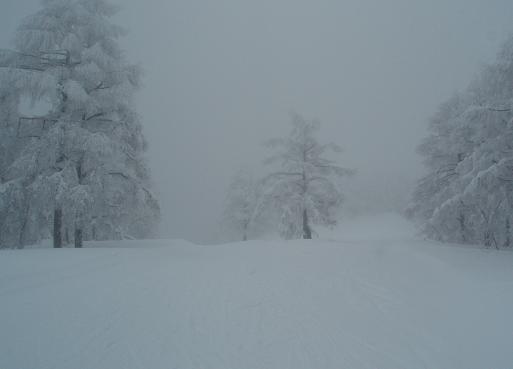 地面の切れてる先から壁。蔵王、横倉の壁。・・・へと向かう道。深い霧に包まれたこのスキー場。いつものように壁の斜面に向かった。あれ? 今日は誰もいないな。視界は霧に遮られ、音は雪の中に滲みこんでゆく。なぜか急に不安になった。白い異空間にひとり迷い込んだのか・・・。何かに見られてるような気がして振り返る。白い霧だけ。前に向き直ると、雪を乗せた木々が私を手招きしていた。魂を宿し、魔界へと誘ってるかのように。進む先に待っているのは、魔界への谷底か。私は吸い込まれるように壁から落ちていった。そして、快楽の世界へと堕ちていった。あ、いや、横倉の壁を滑って気持ちよかった、ってことでガス。天気はガスでガス。その日は5時間券を買って、一人なのでゆっくりと滑る気でいた。朝の体力のあるうちに壁を2~3本滑ってから、上に行く予定で。まず1本滑った。1本が2本。2本が4本。4本が8本。8本が16本。16本が・・・って、ガマの油売りじゃないんだから(笑)やはりここは魔界だったのだろうか何かに取り憑かれたように、繰り返し滑ってた。気が付くと、まるまる3時間ぶっ続けで。もう上に行こう、もう上に行こう・・・と思いつつリフトを降りると壁の方に向かってしまうのだ。絶対に憑かれてた。足も疲れてた。なんちゃって。その後、上のパラダイスゲレンデで昼食も取らず、自販機のホットココアだけ飲んでやっぱり滑り続けた。夕方、ふもとへ下山途中、横倉の壁の近くを通ったら・・・また私を呼ぶ声が?・・・1本だけ寄って行こうかな。そして、1本が2本、2本が4本・・・・って、またかい!(笑)時間チケットぎりぎりまで4~5本、また憑かれたみたい。でもこの最後の数本で、新たなレベルアップができた。ブーツのタンを、今までよりも少し強めに押すっていうか潰すだけのことで、まぁ極めて感覚的なことなんだけど自分の中では劇的な進歩があった。いわゆる、開眼したってやつだ(笑)あとは、以前からやってたことの徹底としてこれからするターンの、もひとつ先のターンをイメージするってこと。三日月形のシュプールを映像としてイメージするのだ。調子がいいときは、先を行く自分の後姿も見えちゃう。そうすることで、上体がローテーションしなくなるし行き当たりバッタリの滑りじゃなくなる。さぁ、もうどんな斜面でもヘッチャラだ♪・・・なんて言ってても、次に行った時は返り討ちに会うんだけどね。でもいいのだ。スポーツは、「俺って天才?」って思う時と「俺って才能ない・・・」って凹むのを繰り返して上達していくもんだから。というワケで、とりあえず今週いっぱい天才のドジボは早くまた取り憑かれたくてウズウズしてるのだ。結局5時間ちょい、休みなく滑り続けてしまった。そんなふうに取り憑かれてみたいアナタもすでに取り憑かれっぱなしのアナタも、クリックしてチョーダイませ。