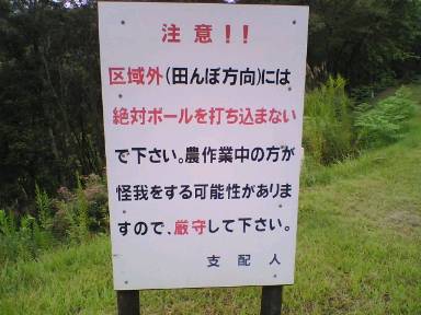 春になると、ボチボチとゴルフの誘いがくる。スキーシーズン中は連絡をよこさないけど「いつまでスキーやってんだ、そろそろゴルフやるべ」とメールが来始めるのだ。そんな友人たちとよく行くゴルフ場に立ってる看板。こんなこと言われても・・・ムリ。田んぼに絶対打ち込まないようにって言われても・・・厳守してって言われても・・・ボールはどこに行くか分からないので私だって困ってるんですけど。さてと、まずは私が打つ。ティーショットを打つ順番は、前のホールのスコアの良い順だ。つまり、私が一番良かったってことだ。ムフフ。「田んぼに行かないように、田んぼに行かないように・・・・・えいっ!」バシッ!!「がぁ~っ! 田んぼに行ったぁ~~!」「ドジボォ、なんでわざわざ田んぼに打っちゃうかな~?」(笑)そう言いながら、次は口の悪い友人が打つ。「ドジボォ、田植えしてるオッチャンに謝ってきなさい。アッハハ。ハハハ。・・・ハハ、ハ。 ・・・・。 ・・・・。 えいっ!」ビシッ!!「だぁ~っ! 田んぼに行ったぁ~~~!」打ってはいけない所に何故か打ってしまうのがゴルフだ。意識すればするほど、そっちに打ってしまう。これってスキーの時にもある。林の中を滑ってて、木にぶつかっちゃいけないからと木ばっかり見てると、何故かその木に近づいてしまう。人間の体は、悪いイメージにしても良いイメージにしても強く意識したことに勝手に反応してしまうのだ。だから、林の中では木を見ずに木と木の間の滑るルートだけを意識して見ればいい。そうすれば林の中でも簡単に滑れる。ということは、ゴルフ場のこの看板も『田んぼに打つな』は逆効果で『フェアウェイの真ん中に打ってください』と書いてフェアウェイを意識させればみんなフェアウェイにナイスショット! になる。・・・ワケないのは、どちて?(笑) ←ワンクリックしてチョーダイませ。田んぼに打ち込んでマスターズ予選落ちした石川遼くんもクリックしてます。(うそ)(田んぼになんて打ち込んでないし)(だいたいにしてオーガスタに田んぼ無いし)