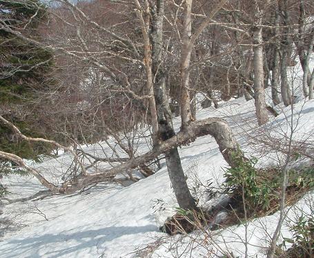 蔵王でGWまで滑れるエリア、パラダイスゲレンデ。ハイシーズンには霧氷が綺麗なパラダイス。蔵王で一番雪質がいいパラダイス。探偵ナイトスクープのパラダイスと一緒にされちゃ困るよ(笑)そこのリフトに乗ってると、なにやら気になる木が見えてくる。雪の重さで木が折れてしまって・・・でも、死んじゃいなかった。木の先の枝は生き生きと成長している。そして何より、折れたあたりから新しい幹が伸びちゃってるよ。しかも2本も。この木、根性ありすぎ。まるで、幾多の苦難にもめげず成長する「おしん」や「細うで繁盛記」のようだ。いや、どちらも観てなかったけどなんとな~くそんなイメージかな、と(笑)ま、この木を見習ってみんなも根性入れて滑るように。私? 私はちょっと腰が痛いので根性はほどほどにして、のんびり滑りますワ。ドジボさん、前回も今回もおざなりの記事じゃない? と思った人も小ネタ集にまとめて載せる記事を、小出しにしてない?と思った鋭い人も・・・これからは根性入れて書きますのでクリックしてチョーダイませ。