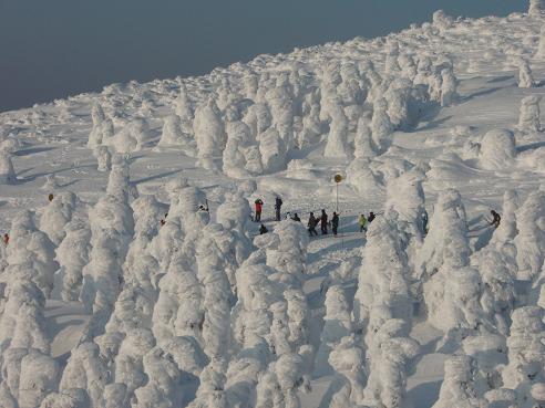 蔵王山頂からの「ざんげ坂」滑り出し。樹氷原コースの始まり。今日の蔵王は、上の方に一日中雲がかかってたから下の方のゲレンデでずっと滑っていた。帰る間際、ほんと最後のリフトに乗ってるときふと見上げると、今日初めて山頂が見えた。あ、こりゃ行かねばと、それから慌てて頂上へ向かった。もう4時過ぎだっちゅうのに。で、係りの人に「間もなくコースクローズしますよ~」と追い立てられながらもそんなことを気にするドジボなわけもなくゆっくり写真を撮っていたのだ(笑)だって、頂上にはまだまだたくさん人がいたもん。そうそう、今日もそうだったんだけど今シーズン、蔵王ってお客さん増えてないかな?去年とかより混んでるような気がする。スキー場、賑わってほしいね。久しぶりにスキーに行った人も久しぶりにこのブログ読む人もクリックしてチョーダイませ。