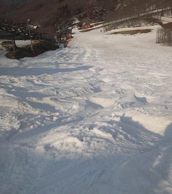 昔は、全面コブの斜面が結構あってコブを滑れないと麓に帰れなくなっちゃうからコブを滑る技術はある程度必要だった。今じゃそんなことない。コブを滑れなくたって全然へ~き。だって、コブ斜面なんて滅多にないんだもん。へたすりゃ、スキー人生一度もコブを滑らなくて済んじゃうかもしれない。それほどコブ斜面が激減してるのに一生懸命コブを練習してる人が結構いる。てか、コブじゃなくて溝ね。でっぱりじゃなくて、えぐれね。自然にはできない溝をみんなでムリヤリ掘ってそこにドスンドスンと入ってる。ゲレンデを滑る分には必要ない技術なのになんで練習するんだろ?って不思議だったけどこないだ思いついた!これはアイテムなのだと。ボードでいう、レールとかボックスとかと同じようにスキーヤーが楽しむアイテム「ミゾ」なのだと。それなら分かる。あ、いや、私にはレールやボックスやミゾの面白さは分からないけどそれを面白いと思う人がいるってことは分かる。だから、みんなしてミゾをこしらえて楽しんでるんだね。でも…楽しそうに見えないのは私の気のせい?(笑)もし、スキーの技能試験からミゾの科目が無くなったら…誰もやる人いなくなったりして(笑)コブ斜面は自由度があって楽しいから何度も繰り返せるけどミゾの場合は、はみ出ることなくラインをトレースして「はい良くできました」ってだけだもんな~。一回滑れば飽きちゃうから、そのうち興味もなくなっちゃった。私は、こんなミゾアイテムより…こっちで、すっ転んでた方がいいな~。なんだかんだ言って、腰が痛くなるからミゾやらないんでしょ、と思った人もそういえば去年、半ケツ出したドジボの腰に湿布貼ってあげたな…って余計なこと思い出した人もクリックしてチョーダイませ。