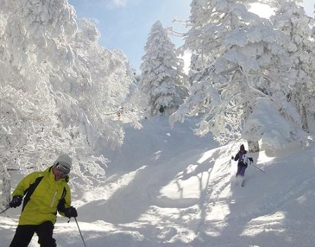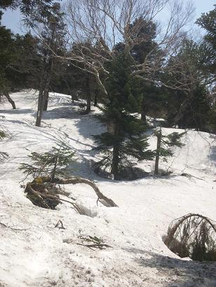 昨日今日と、蔵王にお別れに行ってきた。蔵王の営業は今日、6日まで。ということは、私の今シーズンも今日まで。有終の美を飾るように二日間とも、とぉ~~ってもいい天気だった。これぞ春スキーって感じ。春スキーは、こうでなくちゃ!春スキー オブ ザ イヤー!春スキーの中の春スキー!よ、日本一!ってな感じの春スキーだった♪(…いみふ)どこ滑ってもザラメ雪なので、チョー楽しい。普段はあんまり滑らないゲレンデの真ん中だって滑っちゃう(笑)もち、いつものこんなとこも。この時期の林は葉っぱは落ちてるし、折れた小枝も落ちてるし芽吹いた枝が雪面から顔を出してるしで障害物だらけ。そんなのお構いなしに滑る。パキッ、ジャリ、ガシッゴリッ…。スキーとは思えないような色んな音をさせながら滑る…。もち、ソールは穴ポコだらけ。でも、春スキーの楽しさには適わないのでやっぱり滑る。ま、エッジさえ壊れなければソールに傷が付こうと滑りには影響ないからね。だいたいにして、今日が最後だし。というわけで今シーズン、無事終了なのだ。すでに終了してる人もまだまだ粘る人もクリックしてチョーダイませ。