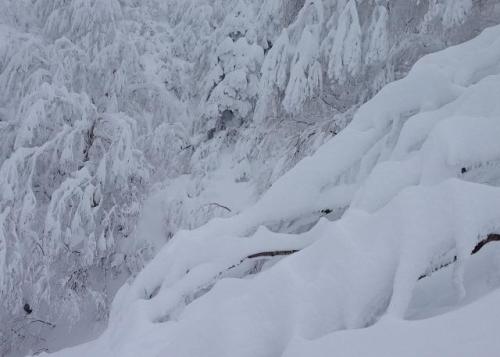 前回の記事でゲレンデ脇の木の写真を載せた。一週間後、その木が埋れてこんなんなってた。あっちゅう間に積もるなあ。さすが、山だ(笑)あ、この積雪ならもしかして滑れるかも! …と思っていつもの場所へ下見に行ってみた。まだ滑れなかった…。雪面からちょぼちょぼ出てる枝がすっかり埋まらないと無理だな。枝ばっかりでほとんどまともに滑れない状態。でも、来ちゃったものはしょーがない…。膝まで埋まる深雪をラッセルして歩き枝を避けながら50cmのすき間を滑りよけきれない枝は踏みつけて歩き汗だくになってやっとの思いで滑り降りた。ここ、全然危険じゃないから遭難する心配はないんだけど…とにかく、ちかりた…(笑)ま、こーゆー下調べは必要だからヨシとしよう。さて、来週はどうなってるかな?(来週も調査に行くんかいっ!)ドジボさん、焦り過ぎ、って思った人もふむふむ、あそこはまだなのね、と参考になった人もクリックしてチョーダイませ。