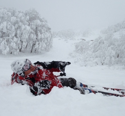 深雪を滑ると転ぶよね。(な、なにをいきなり…) 転ばないようにと大人しく滑っても面白くないから転ぶ不安を頭から除いてスピード出して滑る。 で、案の定、転ぶ(笑) 転ぶのも二つのパターンがある。気づいたときには転んでたのと転びそうになって…やっぱり転んだのと。 例えば、トップが埋まって体が前に投げ出されるパターン。 気づいた時にはもう雪の中にスライディングしている…。 これは、リカバリーの仕様がない。 いや、あった。 急斜面で、ふわふわ粉雪なら大丈夫。 前に投げ出された瞬間に思い切って体を丸めて前転するのだ。 くるんと、きれいに一回転できる。 そしたら慌てず、スキーの上に立ち上がればいい。 って感じで上手くいく……場合もある(笑) CMHへリスキーに行ったときアメリカ人の兄ちゃんたちは自ら前転して遊んでた。「Hey、ドジ~ボ、Youもやってみなよ!」 と言われて、やってみたら意外と簡単だった。リカバリーに使える。 もひとつのパターンは片足を取られたりしてバランスを崩して転んじゃう~って思いながら転ぶパターン。 転ぶまでのほんの数秒の間にいろんなことが頭を巡る。 『 うわぁ! 転んだら顔もゴーグルも雪まみれになっっちゃう! 立て直さなくっちゃ! あ、でも無理…。 このまま転んじゃお 』リカバリーを諦めた瞬間から世界がスローモーションで動き出す。『 あぁ、この、ふわっふわの雪に倒れこんだら気持ちいいだろうな~♪ 』 転ぶことの恐怖感が気持ち良さへの期待感に変わっていく。まるで、高級ホテルのふかふかのベッドに飛び込む時のような期待感(笑)ばふっ!粉雪に包まれて…『気持ちいい~』。バランス崩してからここまで数秒これだけのことを考えてる。こっちのパターンの転び方はもう転ぶのを楽しむしかない(笑)ま、どっちにしろ雪まみれになると自分でも大笑いしちゃえるから転ぶってのは楽しいことなんだな♪というわけで、これも楽しんで転んでんだよ。(今日の記事って……転んだ言い訳か)転んでこそのスキーだよね、って思った人もどうでもいいけど、ドジボさんってよく転ぶよね、って気づいた人も転ぶのを正当化しないとやってらんないよ! ってドジボにクリックを。