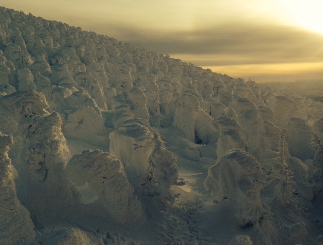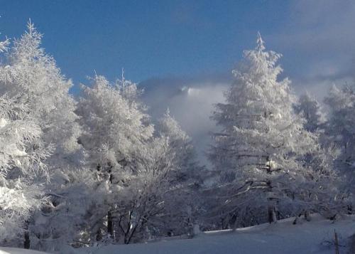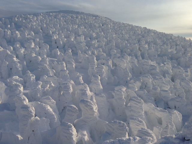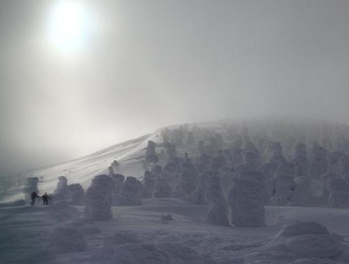 今シーズン、蔵王8日目にして 初の青空。 やっとの青空…。 ま、そんだけ天気が悪いからこそ でっかい樹氷が出来るんだけどね(笑) 今年は特に天気が悪い日が続いてた。 てことは…樹氷も近年になく大きくなってるってこと♪ パラダイスゲレンデのリフトを上がった辺りでも 立派な樹氷が出来ていた。 夕方、その辺りでのボーダー数人の会話…。 「樹氷すご〜い! かんど〜!」と、女子ボーダー。 かわいいボーダーだった♪ (←話に関係ないから…) 彼女に応えて、リーダーっぽい髭のボーダーが言った。 「頂上に行ったら、もっともっとスゴイよ」 「えぇ、そうなの⁈」 「今からでも行ってみる? なかなか蔵王に来れないんだから 一生の思い出になるよ♪」 「行く行く〜! 絶対行く〜!」 聞いていた私 そーだそーだ、行け行け! と呟いていた(笑) 髭ボーダー、Good job! きっとみんな、喜んでくれただろうな。 自分で樹氷を見るのも好きだけど 他県の人が喜んでる様子を見るのも だ〜い好きなのだ。 あ、私自身、他県の人だけどね(笑) 今日、蔵王に居れた人 超ラッキーだったね♪ アタシも樹氷見た〜い! って人も 樹氷、食べてみた〜い! って人も… 意外とサクサクホロホロ繊細な食感だよ、ってことで クリックしてチョーダイませ。