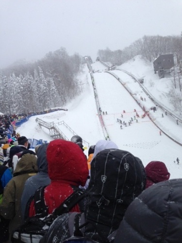蔵王のジャンプ台。なんと、着地バーンを人がスキーで踏んで整備している。横滑りのデラ掛けじゃなくて、一歩一歩踏んでるのだ…。まさか、まさかの、がっくしな…女子ジャンプ観戦記。いや、がっくしなのは女子ジャンプじゃなくて観戦した私の方…。こないだの日曜日蔵王で女子ジャンプのW杯があったので観に行った。ジャンプにはあんまり関心がないんだけど話題の高梨沙羅ちゃんが出てるから。さてさて、初めての観戦で一番感じたのは…とにかく寒いってこと(笑)スキーしてれば少しは温まるんだけど立ってるだけなので体がどんどん冷えてくる。でも、ま、これはしょーがない。寒い冬に、わざわざ雪山へ出かけてるんだから。競技は10時開始。私は8時半にゲレンデに着きジャンプ台が見える竜山ゲレンデで余裕かまして朝一新雪を滑っていた。で、会場の混み具合をチェックしつつ開始20分前には、ちゃんと観客席に立っていた。ジャンプの観客席ってのは正確に言うと「席」ではなくただの空きスペースだ。見やすいように傾斜をつけてるとか段を作ってるとかの配慮は全くないほんっと、ただの空きスペースだ。みんな立って見てるので背の高い人が前にいると全然見えないし。まともに見られるのは2列目ぐらいまでかな。なんか、その辺で勝手に見れば? って言われてるよう。おざなりに作られた観客席なおざりにされた観客たち…って感じ。競技を普及させたいのならもっと観客の立場で考えないとリピートしてもらえないよ。さて、試合前に試技が始まった。アルペンでいう前走ってとこか。助走路を滑って来た選手がシュパッ! っと飛び出す。実際に間近で見ると飛ぶっていうより落ちるって感じだ。でも、落ちてきて着地するのかな~ってあたりから浮力が付いたかのようにグ~ンと延びていく。さらに延びて延びて……バンッ! と90mあたりに着地する。おお! すげ~! 3人が試技をしたとこで、しばしの間があって放送が流れた。「風が安定しないため、競技開始を10時15分といたします」あれま…。でも、15分ぐらいなら遅れたうちに入らないか。…寒いけど。しばらくすると、また放送が流れた。「風のため、開始を10時40分にいたします…」え、あと30分後?寒いんですけど…。指を動かし、足踏みをして踊りを踊って(…おい)体を温める。でも寒いものは寒い。足元の雪からも冷たさが伝わってくる。そろそろ限界かも…。競技が始まったとしても最終滑走者の沙羅ちゃんまでもたないかも…。そして、またしばらくしての放送。「開始は11時の予定となりました」むりだと思った…。でも、せっかくだからと、ドジボは頑張った。11時まで頑張った!そしたら…「開始は11時半になりました」だって。もうだめ。この調子じゃいつ始まるか分からない。このまま中止もありえそう…。なにより寒すぎるから一刻も早く体を動かしたい。ってことで、会場を後にして滑りに行ったのだ。なんか、話が長いね。まだ続くんだけど…(笑)まいいや、書いちゃお!他のゲレンデで滑っていたドジボ。ジャンプ台の様子は見えないのでまだ待機中なのか、中止になったのかそれとも、始まったのかは分からない。ただ、ゲレンデでもこんなに吹雪いてるしガスで視界も悪いから競技をしてることはないだろう。しばらく新雪を楽しんだ後昼飯を食べにゲレ食に入った。みそラーメンを食べながら携帯で大会の様子をチェックしてみる。おや? おやおや?競技、やってるじゃん!速報で1本目の結果が出てるじゃん!沙羅ちゃんが1位だ。2本目は12時40分開始って書いてある。今は12時半…。よし、急げば間に合うぞ!慌てて残りのスープを飲んで……でもダイエット中なので全部は飲み干さず(笑)ダッシュで会場へ向かった。リフト1本乗ってそこから一気に2つのゲレンデを横切って行く。会場に着いたのは12時50分。お、まだ始まってないぞ。間に合った~♪ジャンプ台全体が見える場所も確保。…と、私のスタンバイ完了を待ってたかのように放送が流れた。「風が安定しませんので、2本目はキャンセルとなりました」……。がび~ん。始まる前まで会場にいて競技の間はスキーしててまた会場に行ったら終わっちゃった…。結局、沙羅ちゃん見られなかった。何してたんだろ、私?あほ、と思った人もドジだなぁ、と思った人もあ、だからドジボか…と気づいた人もクリックしてチョーダイませ。