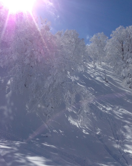納涼写真。蔵王の樹氷原コースの滑り出し。滑りに夢中になり過ぎないで、周りの樹氷も眺めてね♪CMHヘリスキーはカナディアンロッキーの山の中のロッジや麓のホテルに泊まって1週間、毎日毎日ヘリスキーをするってものだ。ゲストの定員は44名と決まってる。ヘリに乗れる人数の関係で。11人ずつ4班に分かれてそれぞれのグループにガイドが一人つきグループごとに行動する。ヘリが、まず第1班を山の上まで乗せて行く。戻って来て、次は2班を乗せて行く。で、3班、4班と順番に山の上まで運ぶ。そうしてるうちに1班が滑り降りてくるのでまた別の山まで乗せて行く。そんな風にピストン運転でゲストを運ぶのだ。1本の距離が長く滑って来ると結構疲れるのでみんな、ヘリの中では備え付けの水やスポーツドリンクをむさぼるように飲む。休憩はヘリの中だけ。しかも数分。だって、数分で山の上に着いちゃうから。これを繰り返すと慣れないうちは太ももに乳酸が溜まりまくる。もう限界…って思うこともある。そんなとき、どうすればいいの?カナディアンロッキーのど真ん中で足つって動けなくなったなんて笑い話にもならない(笑)でも大丈夫。疲れたら、ロッジに帰る機会は何度かある。午前中2~3本滑るとランチタイムになる。ランチは山の中で食べる。ヘリがロッジからサンドイッチや紅茶を運んでくるのだ。山の中で食べるサンドイッチ、旨い!ツナサンド、野菜サンド、ローストビーフサンド…具だくさんででかい。全種類食べたくなるけど2個でお腹いっぱいだ。紅茶を注いで熱くなったカップを両手で包んで温まる。猫舌の私は、ふ~ふ~と吹きながらすする。ジャムがたっぷり入ってるようだ。山の中、この熱さと甘さがホッとさせてくれる。ランチが終わってヘリがロッジに戻るとき一緒に乗って帰れるのだ。疲れた人だけじゃなくのんびり楽しみたいという年配のゲストも午前中だけ滑って帰ったりする。CMHには金持ちの年配者が結構来るのだ。午後からはゆったり読書でもするんだろうな~。私のように、せっかく来たんだからとガツガツしてない…(笑)さて、ランチタイムに1人帰るとグループは10人になる。単純な引き算だ。うちの班は2人帰ったので9人になった……はずなのに、ならない。何故か11人いるぞ。代わりに誰か入ってきたようだ。誰だ? どこから来た?(笑)なにやら、見たことのある兄ちゃんと姉ちゃんだな。あ、ロッジのショップの兄ちゃんだ。この姉ちゃんはストレッチのインストラクターだ。あっちの班にはレストランのコックがいる。そう、ゲストに欠員が出るとスタッフが入ってくるのだ。そりゃそうか。彼らはヘリスキーをしたくてここに勤めているのだから。レンタル係の兄ちゃんは年収が大幅に減るのも構わず大手新聞社を辞めてきたと言ってたし。おめ~ら、欠員が出るのを虎視眈々と狙ってるな(笑)スタッフも滑りたがるCMHなのだ。あら、アタシもスタッフになろうかしら、と思った人もアタシはお金かせいで優雅なゲストになりたいわ、と思った人も深雪好きならクリックしてチョーダイませ。→にほんブログ村→一応CMHのリンクも貼っておく。ランキング押してから行ってね♪→CMHジャパン