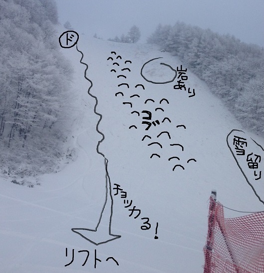 スキー場でゲレンデやコースを滑るとして。(え、それ以外にどこ滑るの?)え、いや、ちゃんとゲレンデを滑ってるよ。(……)……。蔵王でのゲレンデミシュラン!★★★ 横倉の壁。唯一の三ツ星。もう大好きっ! 大好きすぎて頬ずりしちゃいたいくらい。笑してるけど。…転んで。ここに来るといつも1~2時間は平気で遊んでる。最高で3時間ぶっ続けで滑ったことがある。休みなく20回滑った。飽きないのだ。もう1回だけ、もう1回だけ…って入って行ってしまう。年末の29日も、ブッシュはあるものの新雪だったので楽しくて楽しくて10回以上繰り返した。でも、そんなことも雪質がいいときだけの話。翌日行ったら、雪が硬くなってたので1回滑ってパス。「こんなんじゃダメだ。もう用無し」そう言ってリフトから振り返る壁は散々滑り荒らされてブッシュが更にあらわになってどこか寂しささえ漂わせていた。まるで、遊ぶだけ遊ばれて身も心もボロボロになって捨てられた女みたいで…ちょっと可愛そうだった…。ごめん、壁。またきっと来るからね。君が、きれいに化粧直ししたらね。笑ということで、三ツ星は横倉の壁。ただし、雪質のいいとき限定。アイスバーンのときは凶暴女に変わるので君子危うきに近寄らず。それと、2シーズン連続で雪崩れて閉鎖されてた壁よ。今シーズンはヒステリー起こさないでね♪滑るときのポイント解説コーナー。これほど徹底分析したガイド本はあったろうか?これはリフト乗り場から撮った写真。写真の右サイドが一番急だ。途中に大きな岩があるので注意。雪をかぶってるので上から滑って行っても気付かなかったりする。そのまま調子こいて行くと岩の上からジャンプする格好になってしまう。この岩は回り込んだほうがいい。で、回り込んだ先の後半部分に一番フカフカの深雪が溜まってる。見逃すな!でも私はあんまり滑らないけど。(え?)壁の右サイドに下りちゃうとリフトに乗れないのだ。繰り返し滑るには左サイドに下りなきゃならない。どこを滑ってもいいけど最終的には左下に向かって勢いつけて滑らないと歩く羽目になる。中央サイドは一番滑りやすい斜度かな。でも、すぐコブが出来るしみんなが踏むので固くなりやすい。転んだとき下まで背中で滑り落ちれるというアトラクションを楽しめるのがこの中央サイドだ♪ドジボはいつも写真の左サイドを滑ってる。リフトに真っ直ぐ向かえてめんど臭くないから。だからみんなはこっちに来ないでね。荒らさないでね。ほんとに…来るんじゃねーぞ!…おほん。不適切な発言がありましたことを訂正はしませんがお詫びいたします。この壁のリフト林に囲まれてるので吹雪のときも意外と寒くない。それも繰り返し滑っちゃう要因かな。そんな感じで三ツ星横倉の壁を楽しもうぜい。急斜面大好きな人も誰かにここから突き落とされた経験がある人もクリックしてチョーダイませ。にほんブログ村人気ブログランキングへ