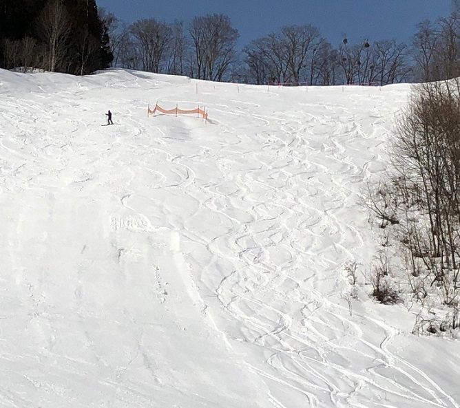 蔵王の大森コース。もうハゲてる…。コースの日陰のとこは固い。土曜日に蔵王へ。かつてのホームなのになんと今シーズン2度目。1週間前に痛めた膝の様子を見ながらなのでガツガツ滑らないように。まぁ、新雪がないのでガツガツ滑る要素は全くないんだけど。この週は気温が高かったりしたので大嫌いなアイスバーンが予想される。当日、天気は晴れ。気温も上がる見込み。雪が弛んだ頃に滑れるようにとゆっくり目に家を出た。新雪のときは朝イチの8時半からスタートするのにこの日は10時半から滑り始めた。雪が弛んでるところもあるけどまだまだ固いところも多い。ガガガガガー!私の一番嫌いな音…。下の大森コースに行けばもっと弛んでるかも。ガガガガガー!まだ固い…。ここで、あることに気づく。コースには日陰と日向がある。太陽の偉大さは十分知っている。曇ってて震えていても太陽が顔を出したとたんにポカポカとなる。そうだ、日向を狙うのだ。ジャキ! ジャキ! ジャキ!おお~、弛んでるではないか。春のシャリシャリ雪になってるではないか。この、抵抗なくエッジが食い込む感触がなんとも心地よい。そろそろ12時。もしかしたら、横倉の壁も弛んでるんじゃね?あそこは北斜面で日陰になるし北風がもろに当たるから弛みにくいんだけどそろそろいいかも。行ってみた。ガガガガガー!だみだー!安全にゆっくりとターンを重ねただ降りるだけ。爽快感の欠片もない。ここで転んだら下まで滑落するし。と思っていたら実際に滑落してた人がいた。板を中腹に残したまま…。しょうがないから板を拾って下まで届けてあげた。それで壁は終了。私、この人のために壁に来たようなもんだ(笑)その後は黒姫と大森を繰り返した。ますます雪は弛み自分の思うままのスピードで雪粒を飛ばしながら滑れた。アイスバーンの何が嫌かって安全を考えてスピードを制御しなきゃならないのが嫌なのだ。1ターン1ターン暴走しないように丁寧に滑る。アスファルトの上でも滑ってるかのような激しく細かい振動も嫌。うちの弟子なんか足の裏がくすぐったくなる! と怒ってるし。うむ、確かにくすぐったくなる。笑柔らかい雪でターンの細かい動作なんか考えずにバビュン!バビュン!と飛び跳ねて滑るのが好きなのだ。それが急斜面なら尚楽しい。ということでそろそろ壁はどうだろう。さっき行ってから1時間以上経ってる。もう弛んでもいいんじゃないかい。行ってみた。壁へと向かう平らな通路はさっきとは明らかに違う。柔らかい。こりゃいいかも!で、壁から1ターン2ターン…ガガガガガー!だめじゃん!さっきと変わりなし。さすが北斜面、頑固なやつだ。さて、ちょっと降りちゃったけどどうしよう。このまま滑ってもツマラナイから戻ろうか。でも、カニ歩きで登って行くのもちと格好悪い。ビビッて逃げ出したと思われそう。いやいや、そういう問題じゃなくて自分が楽しいかどうかってことだ。今日の壁、私にとって滑る意味はない。よし戻ろう。いつもは2時間も3時間も繰り返し滑るほど大好きな壁だけど気持ち良く滑れないのなら用はない。壁から逃げたんじゃなくて私のほうから壁を捨ててやったのだ。そのあとまた大森でちょっと遊んで4時間弱の一気滑り終了。柔らかい雪のお陰で膝に負担が掛からずいいリハビリになりましたとさ。固い雪が好きな人も柔らかい雪が好きな人もなんでも来い!っていう猛者もクリックしてチョーダイませ。にほんブログ村スキーランキング
