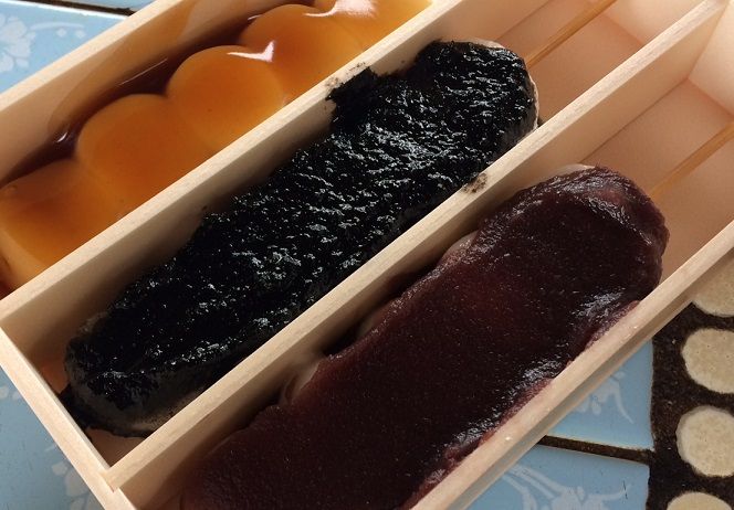あんこ、ごま、みたらしの3種類が入って1箱400円。