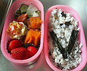 お弁当出来上がり~五穀米に、ブイサインをかぼちゃの煮物、塩鮭、ゆでたまごのサラダ詰め、カブときゅうりのお浸し、いちご母さんにはとても見せられないけど まあ、いいかこれから夫の車を借りて、学校へ行きます。夫はゴールドカードの私に向かって「ぶつけんなよ~飛ばすなよ~」と例によってうるさく言っております 気をつけて、行ってきま~す