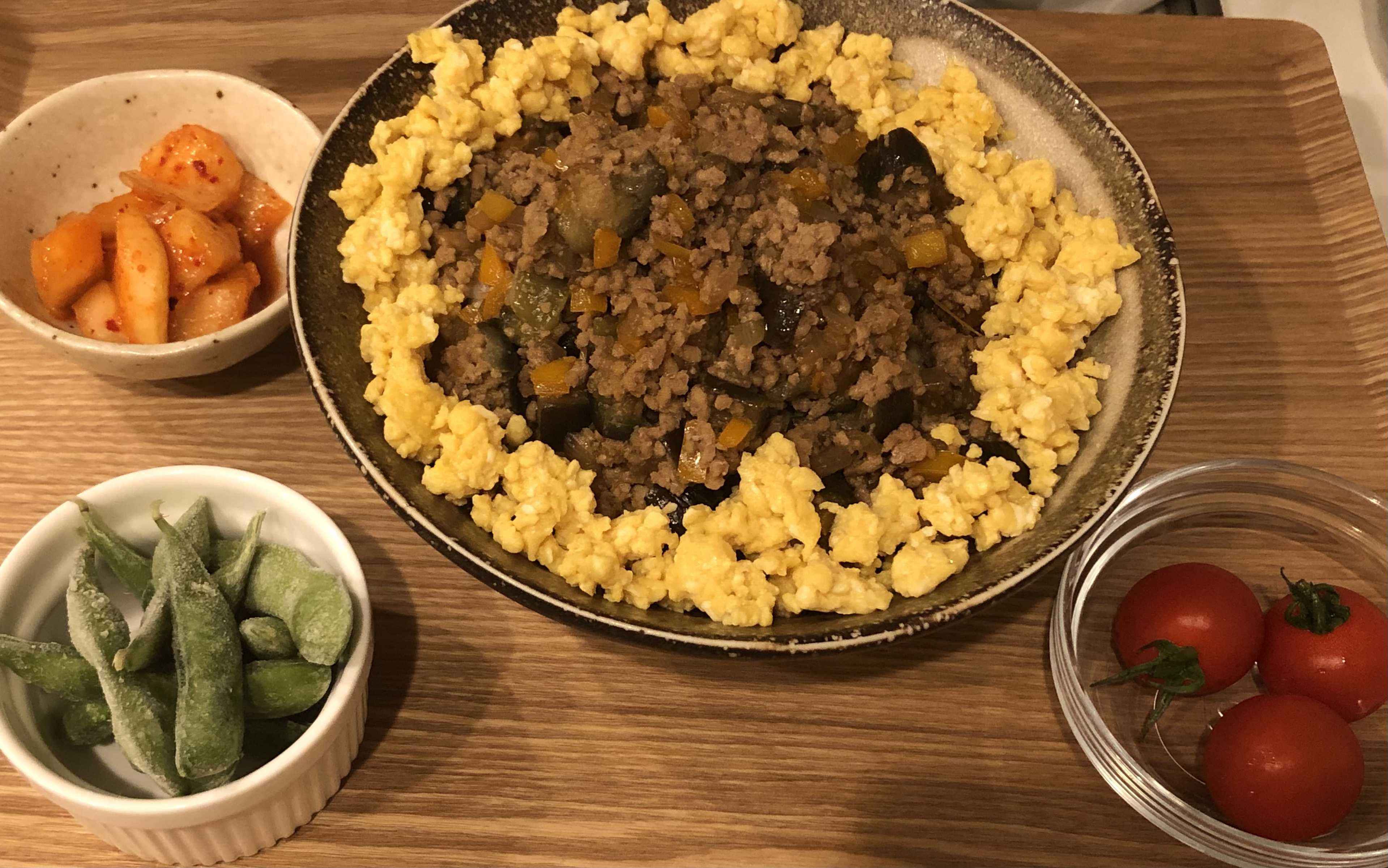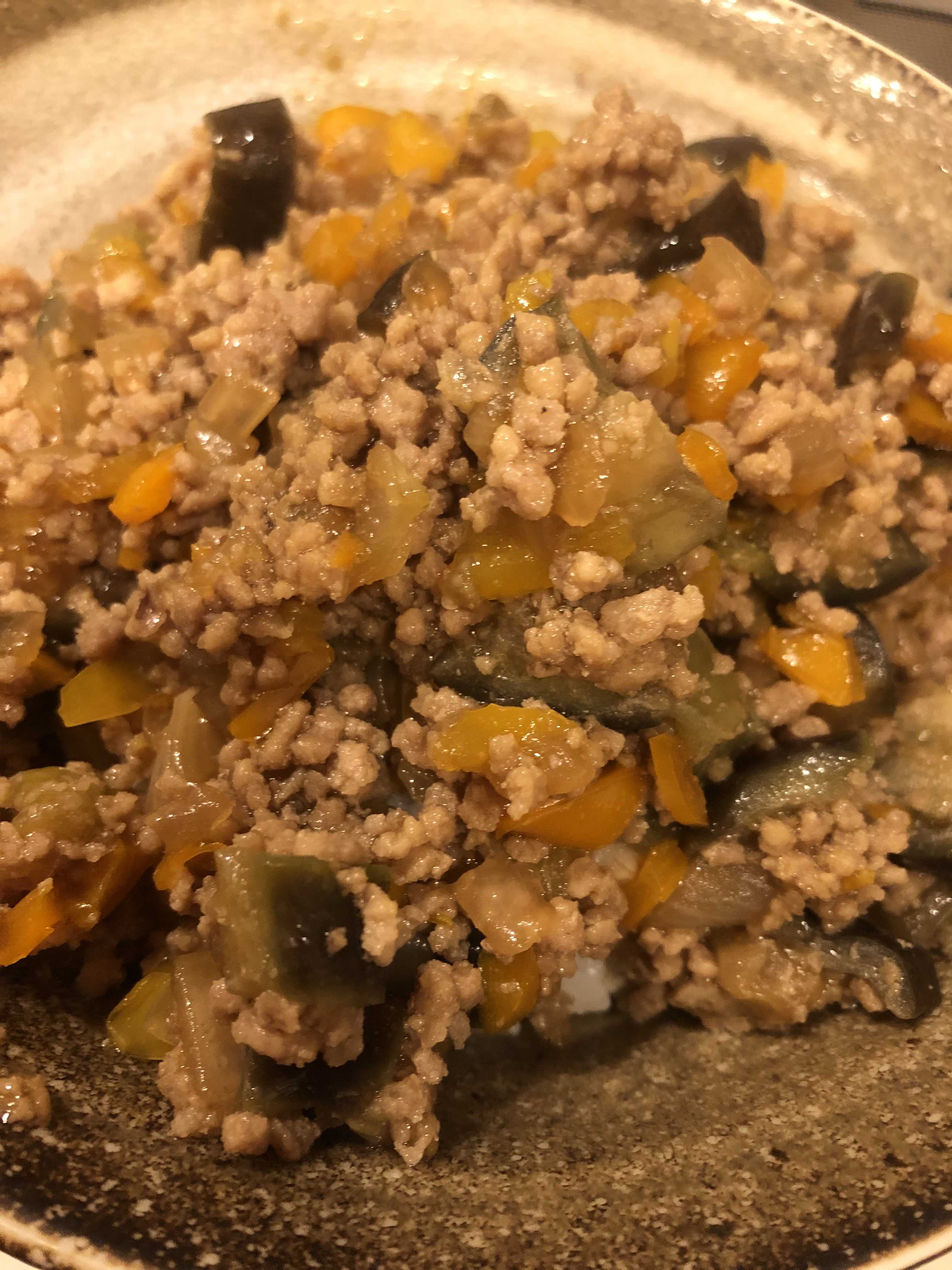 新玉、茄子、カラーピーマン、挽肉のそぼろに。