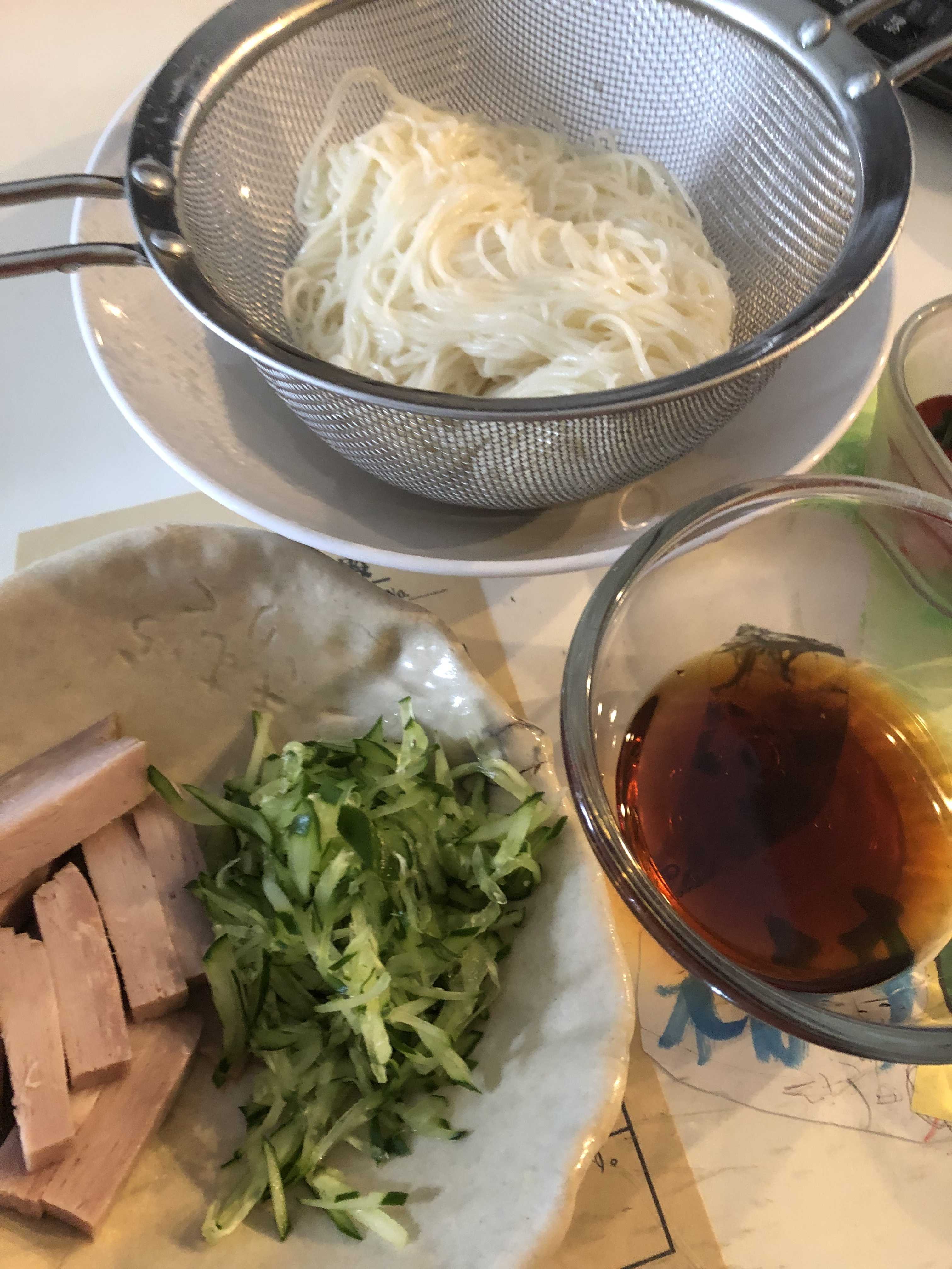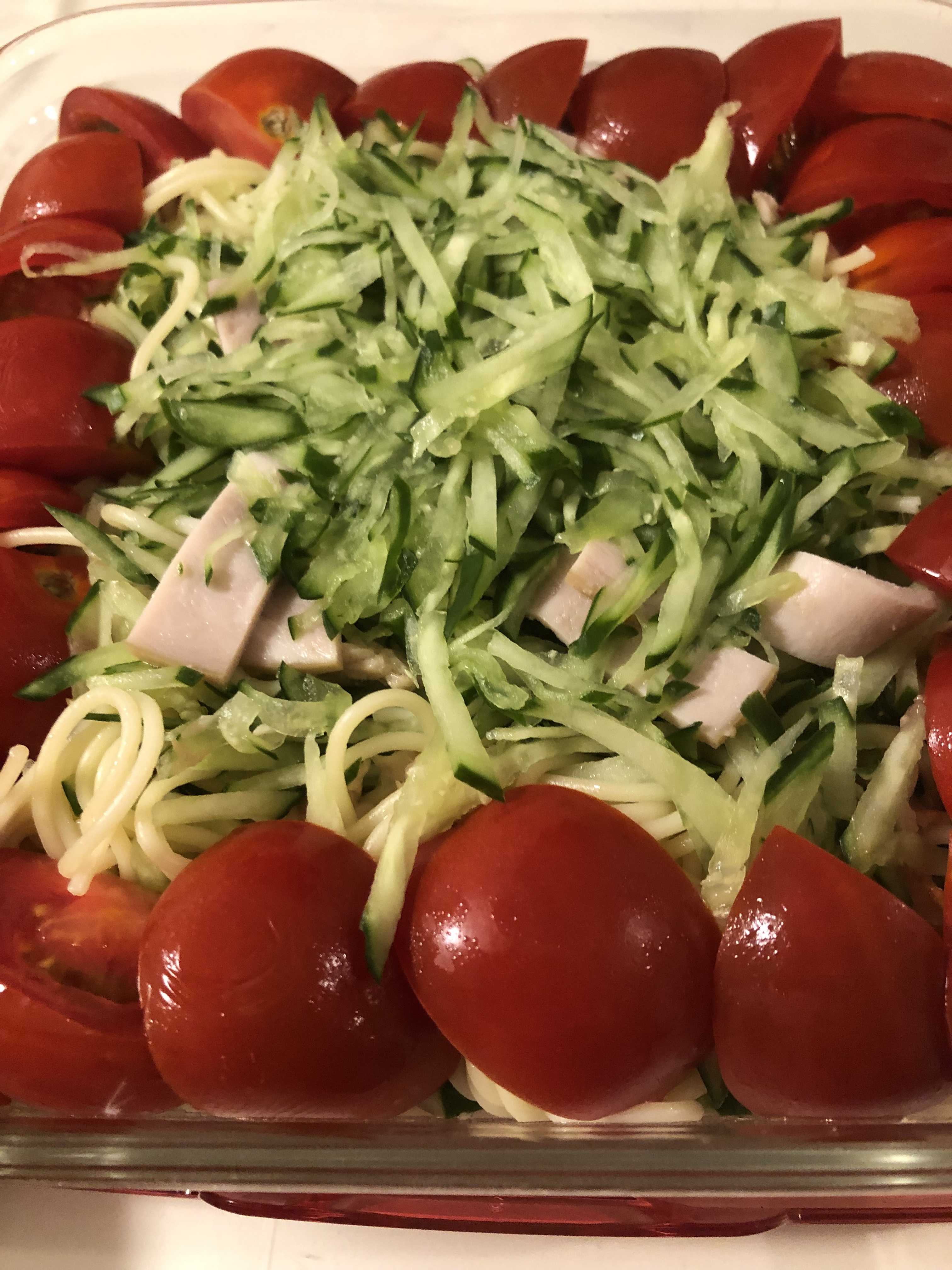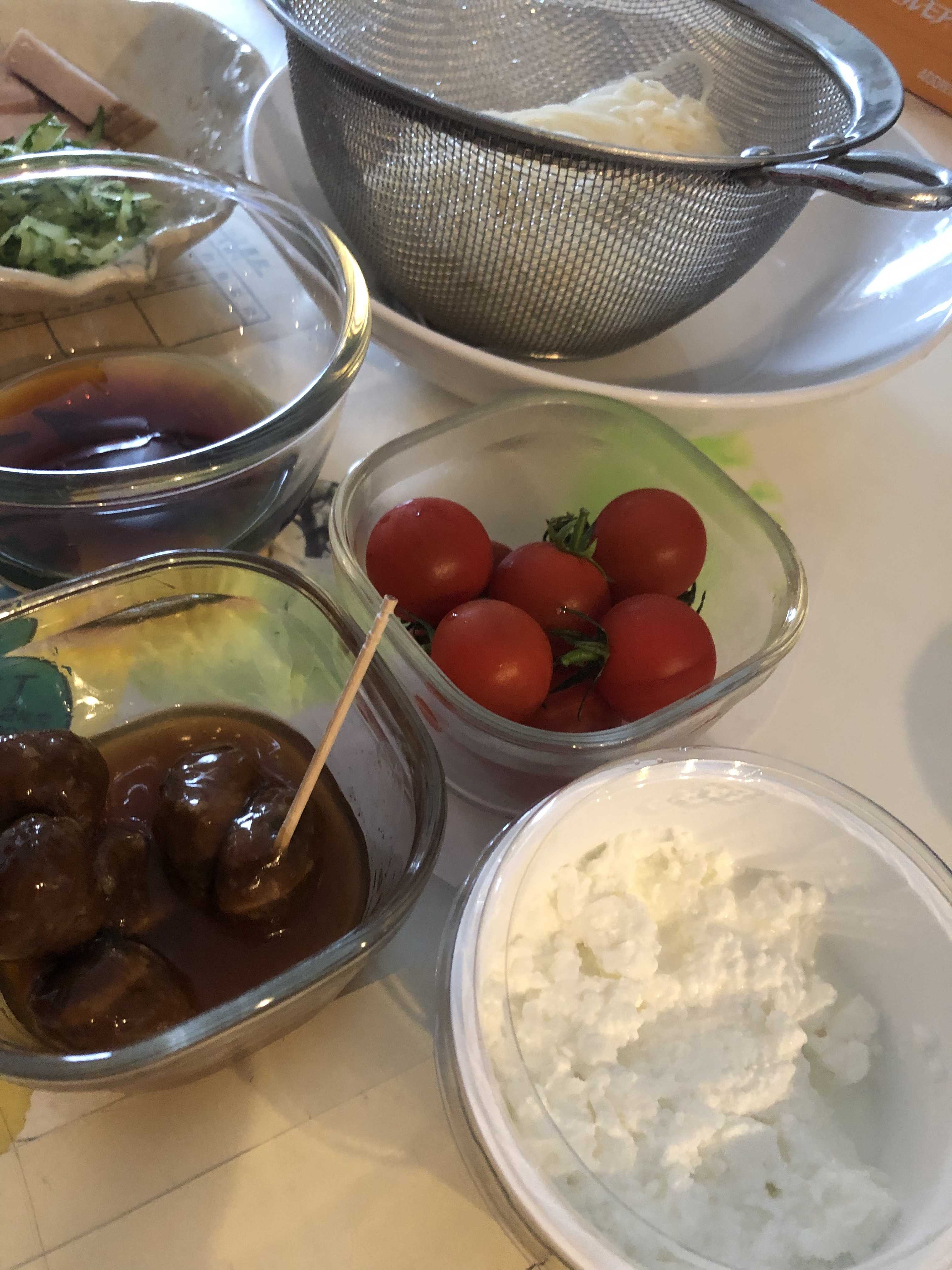 素麺、ミートボール、ミニトマト、ハム、胡瓜、