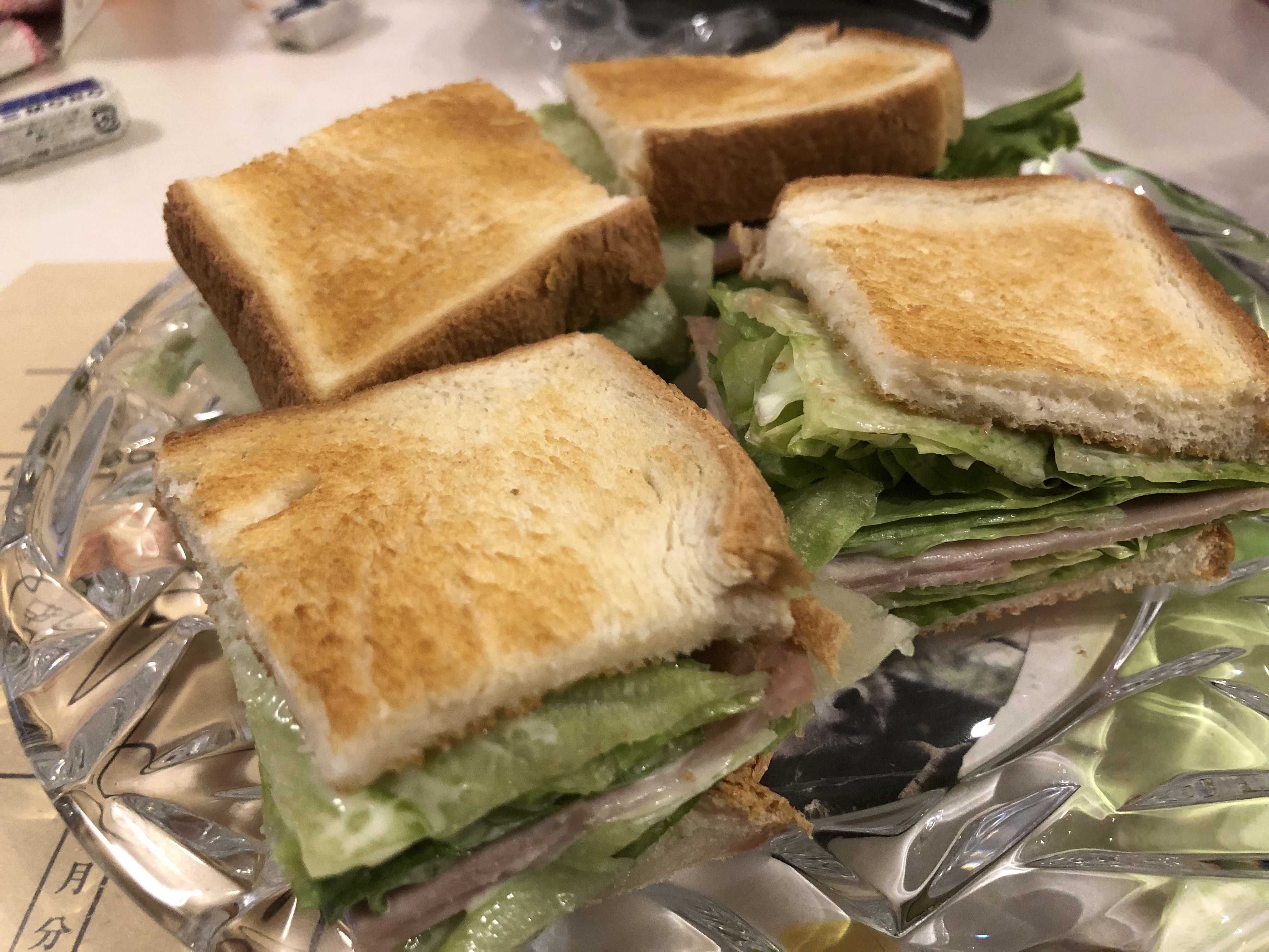 玲、お弁当の残りの照り焼きチキンとハムサンド。