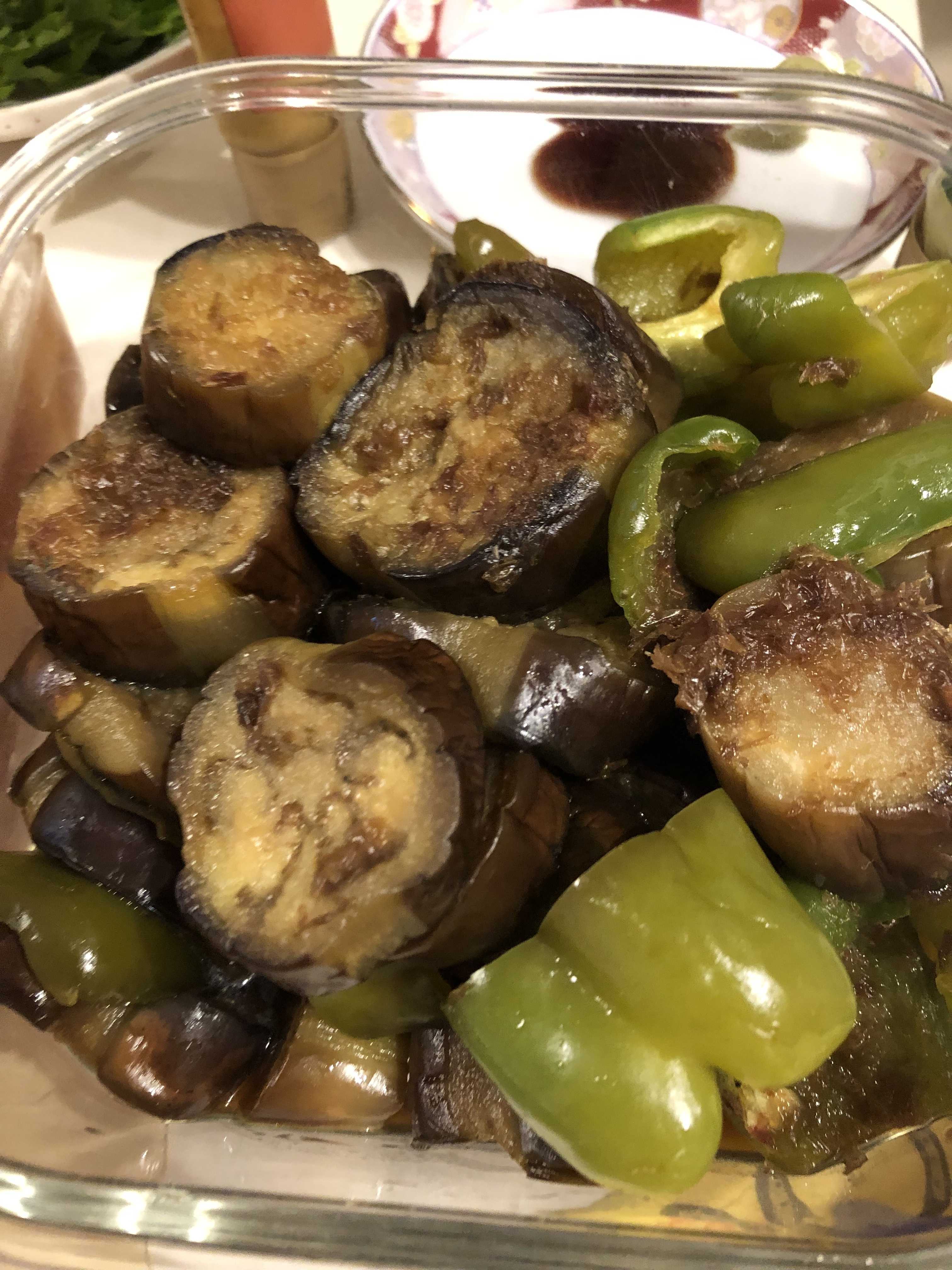 茄子とピーマンの煮浸し(オイルまぶしてオイルで焼く)