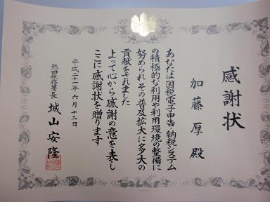 シャープ SHARP 公的認証サービス対応住民基本台帳用ICカードICカードリーダライタRW-5100e-Taxで確定申告や電子申告等行政サービスに便利 本日午前中、熱田税務署にて、e-Tax感謝状贈呈式に出席してきました。昨年は執行部に一員としてでしたが、今年は表彰される対象者となりました。選定基準はよく分かりませんが、私の事務所の場合、今年に限って言えば、法人は100%でした。個人の場合は、年金受給者の関係もあり、約8割ほどだったでしょうか。昨年より多い23名の税理士が出席しました。久々に賞状をいただきました。スポーツをやっていた時はよくもらっていましたが、ここ最近は全くないので、たまにもらう嬉しいですね※※※※※わかりやすい相続税・贈与税と相続対策〔最新改訂版〕加藤厚税理士事務所公式HP