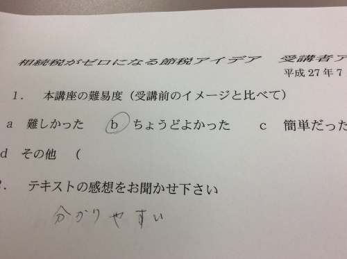 わかりやすい相続税・贈与税と相続対策(’15〜’16年版)著者:加藤厚価格:1,512円(税込、送料込)楽天ブックスで詳細を見る 4月からスタートした中京大学オープンカレッジ『相続税をゼロにする節税アイデア』全12回の講義の中で、最初と最後に受講者アンケートをとっています。これは商売でもそうですが、自分がすべて正しい、あるいは自分に満足した時点で、成長はあり得ません。特にトップに立つと、なかなか心配して助言をしてくれる人が周りにいないのです。これこそ、変なプライドは要りません。謙虚な気持ちで、周りの人の声を聴く姿勢は、経営者に必要ですね。※※※※※わかりやすい相続税・贈与税と相続対策(’15〜’16年版)著者:加藤厚価格:1,512円(税込、送料込)楽天ブックスで詳細を見る加藤厚税理士事務所公式HP