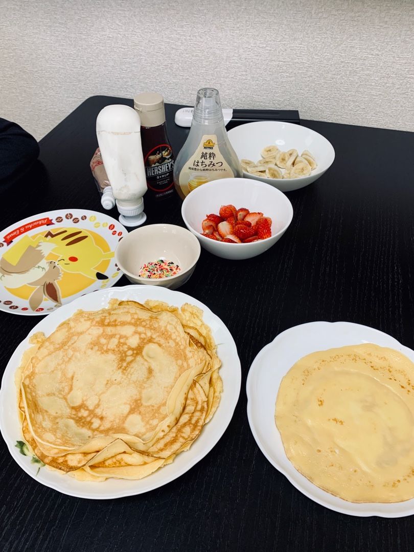 休校のために家に居る息子👦🏻 どっか連れて行ってあげたいけど、それじゃ休校の意味も無いしと思い、基本的に買い物以外はお家に居ます🏠 一昨日は一緒にパンケーキを作り、今日は一緒にクレープを作りました❤️ 甘党な息子は大喜び!! 4枚も食べてました😂❤️ 私も疲れて甘いもの食べたかったしウィンウィンですかね🙆🏻♀️❤️ プリンキットも買ったので来週はプリンをつくろうかな?と考えてます😆❤️