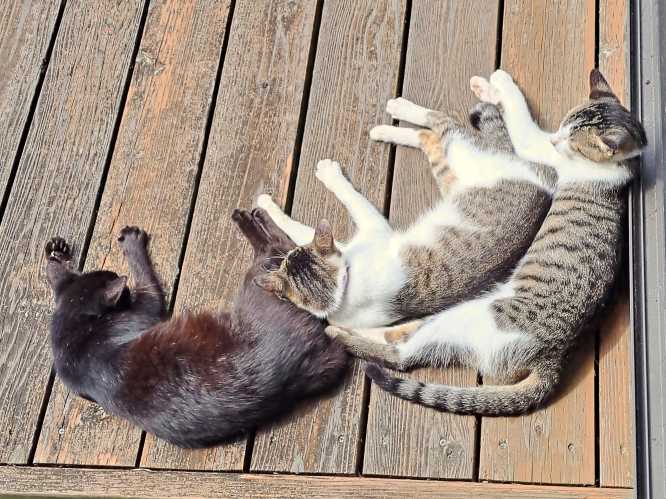 7月下旬に相次いでやって来た迷い猫警戒感はすっかりなくなって3匹仲良く寝そべって過ごしています