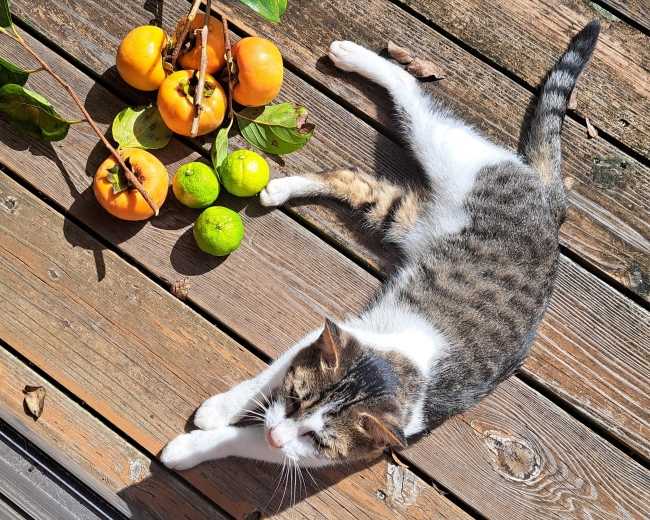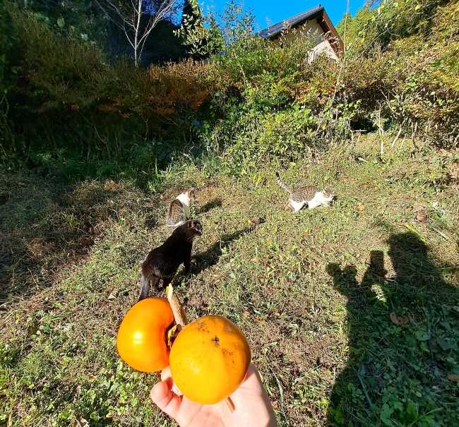 陽だまりが暖かく感じるようになりましたね猫達と一緒に柿を収穫
