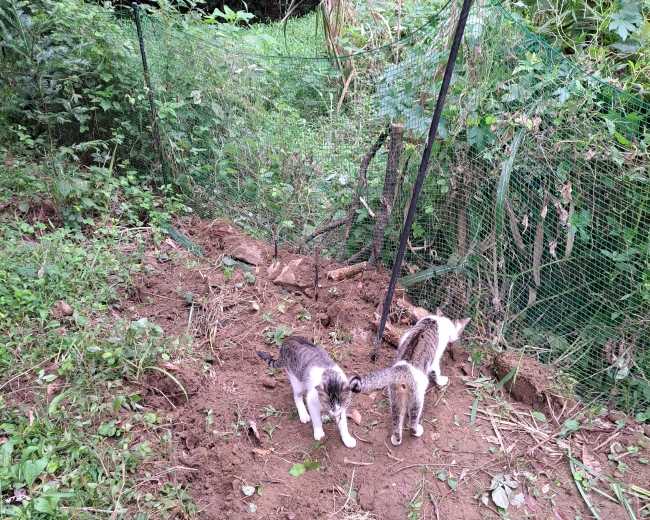 イノシシに侵入されて破かれてしまったネットを直していたら猫達が遊びにやって来てすぐ近くの栗の木に登って大はしゃぎ可愛い奴らです