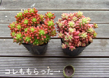 先日いただいたタマツヅリ(「虹の玉」かな?) 2007/01/28 15:39 赤い(左)のとピンク(右)の。育った場所が違うんだって手持ちの多肉と寄植えにしようかどの鉢に植えようか…迷っているうちに日が暮れる結局小さい鉢にバラバラと…使ってないミルクピッチャーにも2007/01/28 18:56 いろいろな場所において成長実験開始。増えたらあげるね ytちゃん小さな小さな鉢↓も お気に入りです2007/01/28 18:56 直径約3センチ♪ (実物は写真より小さい)■関連日記>>人生最大(?)のサプライズプレゼント■オススメショップ>>自由が丘グリーンハウス 東京都自由が丘2-15-10A&Dハウス MAP 東急東横線自由が丘駅から徒歩3分 流木・こけ玉・多肉植物・ジオラママン盆栽・その他 営業時間:主に土日・祭日 Tel:03-3725-3424 ■楽天にもありました>>グリーンカフェ(グリーンハウス) ランキング参加中 クリックで応援してください