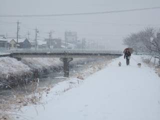 朝の9時ごろから降り始めた雪は、その後も降り続けお昼頃には白の世界になりました寒いのですが、雪の白さは寒さを一瞬忘れさせてくれる美しさです・・・これでお仕事に行こうと思ったらぐったりしますが、今日は幸いにも土曜日・・・つかの間の雪をほんのちょっと楽しんでいました♪相棒と近所に散歩に行ってみました晴れている時でも散歩に行かないのに・・・(笑) 雪の中、ワンコは元気にお散歩中です♪勝手にモデルにしちゃってゴメンナサイ・・・桜の木も今日ばかりは白くお化粧していますね♪数ヵ月後には可愛い桜色に染まるのだと思うと不思議ですね遠くまで続く雪の道・・・普段見慣れている道なのに、何だか違う世界の風景みたい今はもう雪は止んでいますが・・・このままいくと明日の朝は道が凍ってしまうので、交通事故が起こらないように十分注意してほしいですね・・・