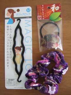 帰りのバスまでに時間があったので、久しぶりに100円ショップのダイソーに寄ってみました♪1週間行かなかったら、新商品がいくつも入荷していてまるで宝探しのようで楽しい100円ショップそして見つけてついつい購入してしまったのが、この3点ちりめんの和柄シュシュと、ひねって止めるだけでアップスタイルが楽しめる簡単ヘアアレンジ用の用具、それに和柄のワンポイントが付いたヘアゴムですヘアアレンジ用の商品は、真ん中に空いている穴に髪の毛を通して毛先を5cmくらい残して外巻きか内巻きにして横に付いているホックみたいなのを引っ掛けると出来上がり♪こんな便利グッズも売ってるなんて、最近の100yenショップはすごいぞ!ちなみに和柄のワンポイントの付いたヘアゴムは、袋から出して持っただけでワンポイント部分が取れてしまいましたぁ(><)mさ・・・さすが100均・・・(笑)今は瞬間接着剤で接着中です♪またすぐ取れちゃうかなぁ・・・?どうだろう?