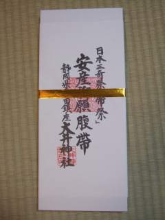 今日は戌の日♪前回の戌の日の時に、実家の母が地元の神社でお払いしてもらった腹帯をお仕事から帰ってきた相棒に手伝ってもらって、一緒に巻きました 箱の蓋を開けると、可愛い犬の絵がプリントしてあるサラシが出てきました巻き方が良く分からなかったけど、取り合えず半分に折ってお腹の下の方からグルグルを巻きつけていきました(巻きつけ後の写真も撮ってみたけど、あまりに不恰好なので掲載は自粛です・・・笑)サラシを巻いた所は、ほっこりと温かくて、お腹を守っているっていう感じがしてなかなか良いじゃないですか!毎日巻くのは大変なので、普段は妊婦さん用ガードルになると思いますが・・・(ガードルも、ママさんが一緒にお払いしてもらってくれました♪)サラシを巻いたまま、夕食にお赤飯を頂きました♪事故米の偽装が騒がれている時なので、お赤飯・・・とも思いましたが、今日はお仕事もあって、とっても作っている時間は無かったのでいつものスーパーで購入してきました・・・だ・・・大丈夫だよね?ちゃんと調べているよ・・・ね?後は赤ちゃんがスクスクと育って、無事に産まれてくれるよう祈るばかりです♪
