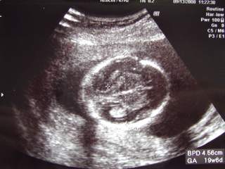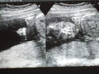 19週目に突入しました♪今日は1ヶ月ぶりに実家に帰って、里帰り出産予定の産院に行ってきました本当は、34週になるまで行かなくて良いのだけど、土曜日もやってくれている産院なので、相棒と一緒に赤ちゃんの成長をエコーで見られるのです!エコーによる対面を楽しみにしている相棒が、「今度はいつ?今度はいつ?」と急かすので3連休の初日に合わせて行くことにしました♪30分程待って診察室に入ると、院長先生はお休みで代務の先生が待っていました電話予約をした時に聞いていた事だったので、少しお話をしてから相棒お楽しみのエコータイムとなりました♪「これが頭ですねぇ~」「これがお腹ですねぇ~この黒い所は胃袋ですねぇ~」と、頭からだんだん下に向かって赤ちゃんを輪切りにしていきます♪お尻~足が写った所で、股の辺りに何やらうつっています・・・心の中で「あ!」っと思った相棒と私・・・先生は何事もなかったかのように通り過ぎて、何も見なかったかのように聞きました・・・「そういえば、性別とかもう聞いてますか?」と先生。「いえ、まだ聞いていません」と私。「聞かない方が良いですかねぇ?」と相棒の顔を見ながら尋ねる先生・・・・・・って、先生、今みえてたじゃん!?「でも、今何か写ってましたよねぇ?」と私が言うと「あははは~写ってましたねぇ・・・秘密・・・っていう訳にもいかないですかねぇ?」とあたふたし始める先生・・・前回アンケートの時に、あかちゃんの性別とか病気とか事前に分かる範囲で知りたいかどうかというアンケートを書いていたのですが、(その時は、全部教えて欲しいに○を打ちました♪)中には生まれるまで、何も知りたくないという親御さんもいらっしゃるのでこの夫婦はどっちだったかなぁ?って先生が思われたのかもしれません・・・「男の子ですよね?」と再度念押しすると、「男の子ですよ~」と、観念(?)したかのように、教えてくれました♪実は前々から男の子という事はある事情で分かっていたので、別に驚きませんでしたが、やっぱりそうか~という喜びはありました♪(その内、ブログに書く機会があれば・・・お話しますね♪)それからは、何だかしつこくお股の部分をエコーで映してくれるので苦笑しながらも、楽しくエコーを見させて頂きましたちょっと前置胎盤の気があるとの事だったので、内診によるエコーも取りましたが子宮孔から現時点で7mmずれているということで、まぁ大丈夫でしょうとお話を受けました健診に行っている病院でも、前回の院長先生の診察でも、前置胎盤とは言われてなかったので、別に心配していませんでしたが、まぁ、時々は健診の病院でも検査してもらおうかなって思いました♪顔アップ♪左側が上で、顔の中心くらいのくぼんだ所が眼窩です♪お尻から足です♪この日の赤ちゃんは、足を伸ばして前屈姿勢していたみたい・・・苦しくないのかなぁ?動画では、手で足を触っているような場面も見られました♪(残念ながら、この写真では例のモノは隠れてしまってます・・・笑)3D(4D?)写真です♪頭が上で顔がやや右向きです手と足で隠れていますが、何となく鼻と口元が見えるかなぁ?という感じです♪