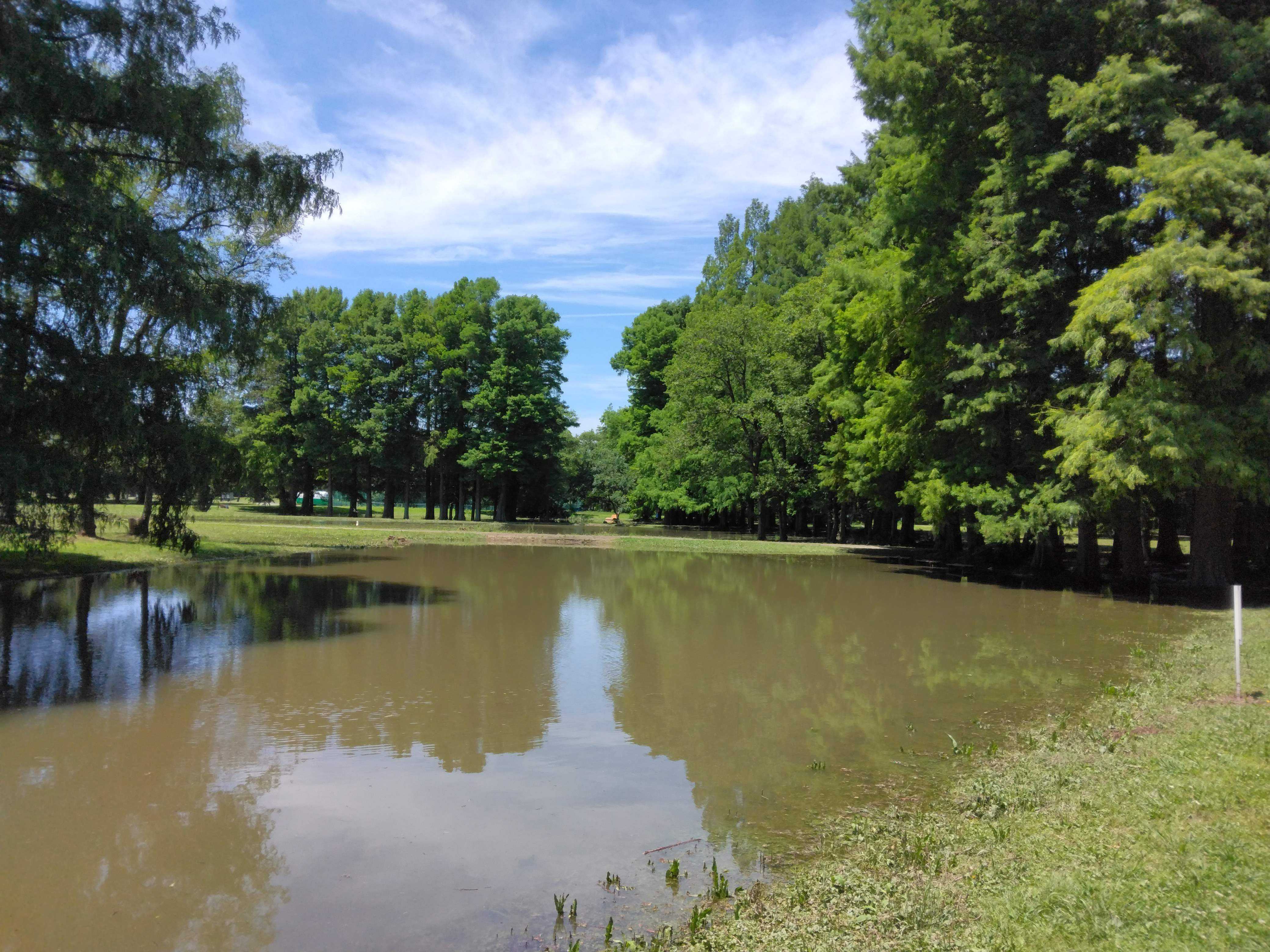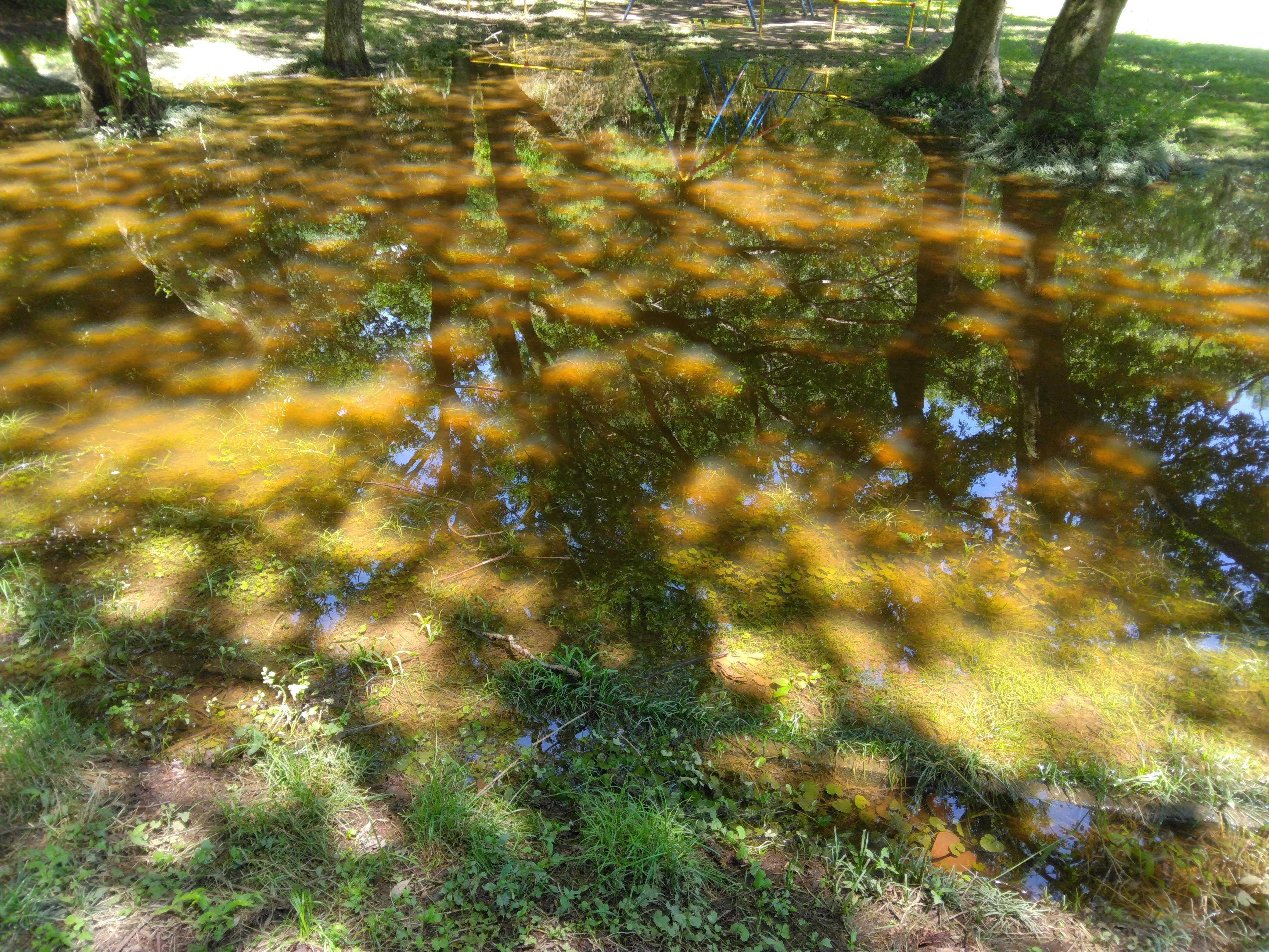 樹林の中の歩道は水浸しで2日経っても水は引いていないですね。水面に映った木々や緑がきれいでした。