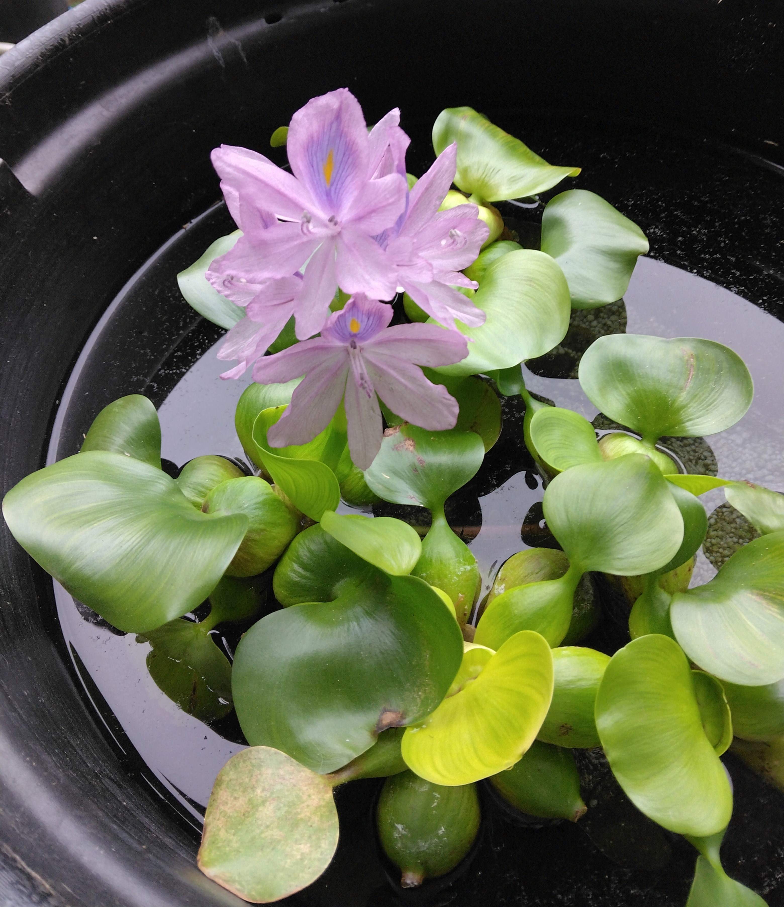 今朝窓を開けるとメダカ水槽に花が咲き始めていた。ホテイアオイの花だった。