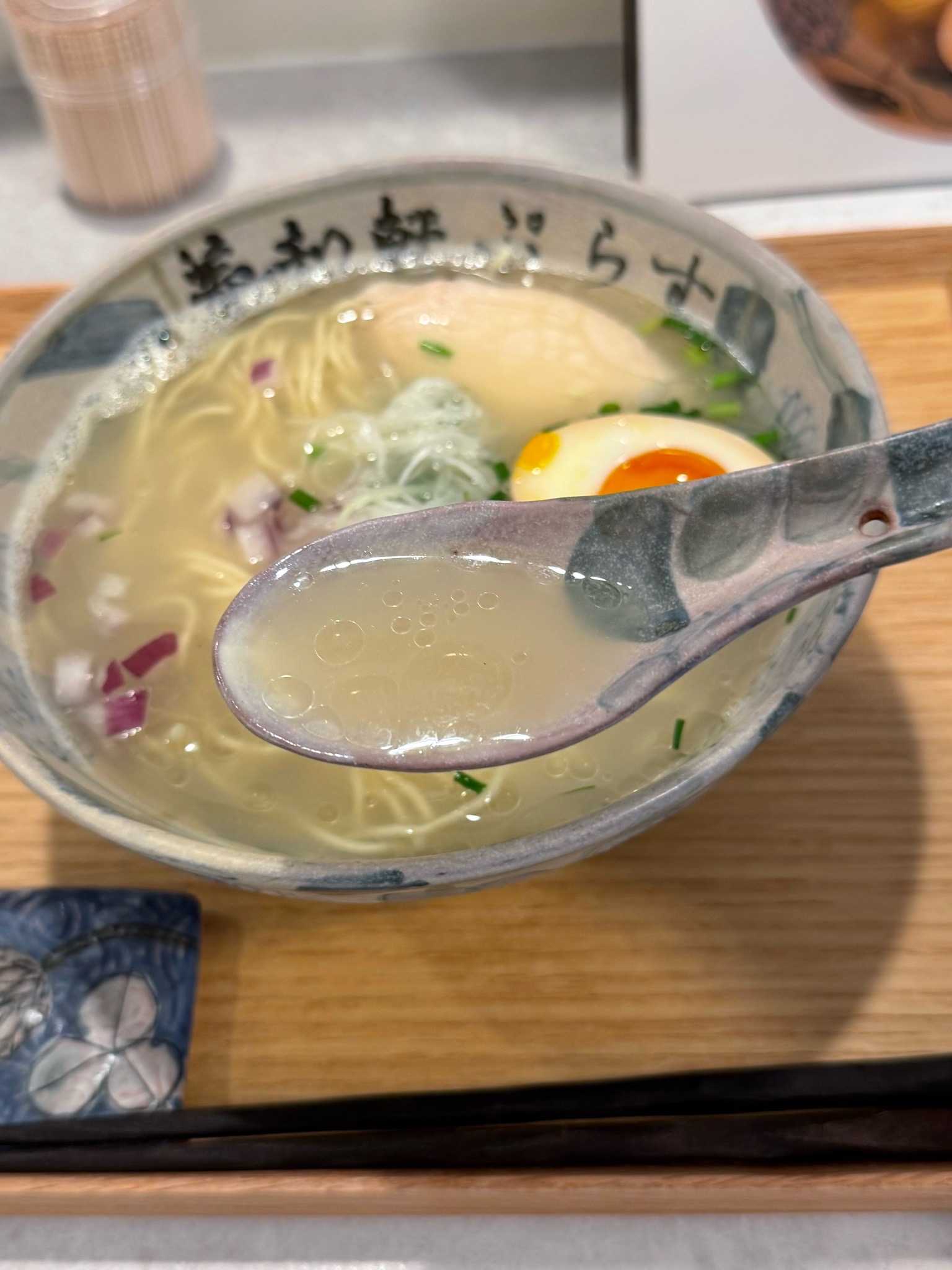 牡蠣としじみのエキスが濃厚で海の香りが広がる軽い乳白色の塩スープ