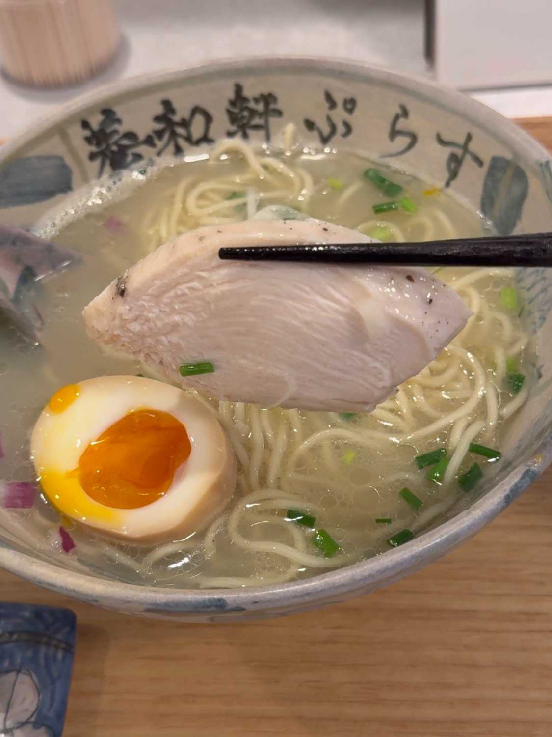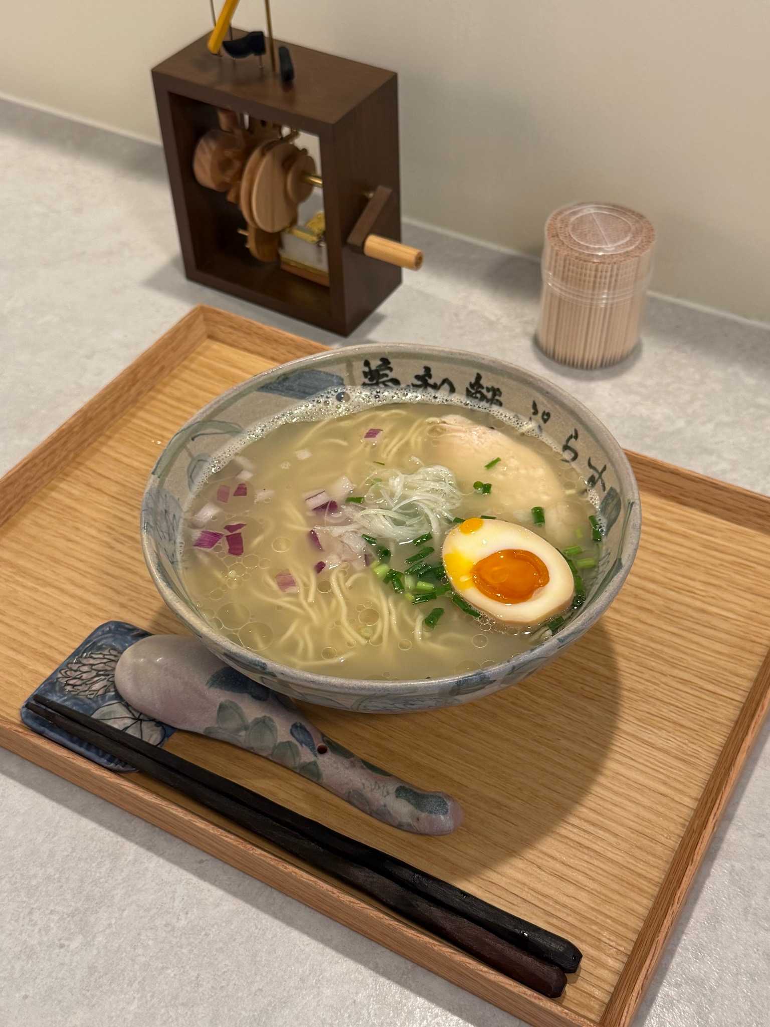トッピングは青ネギ、白髪ネギ、刻んだ紫タマネギ、半熟のハーフ味玉、鶏むねチャーシュー