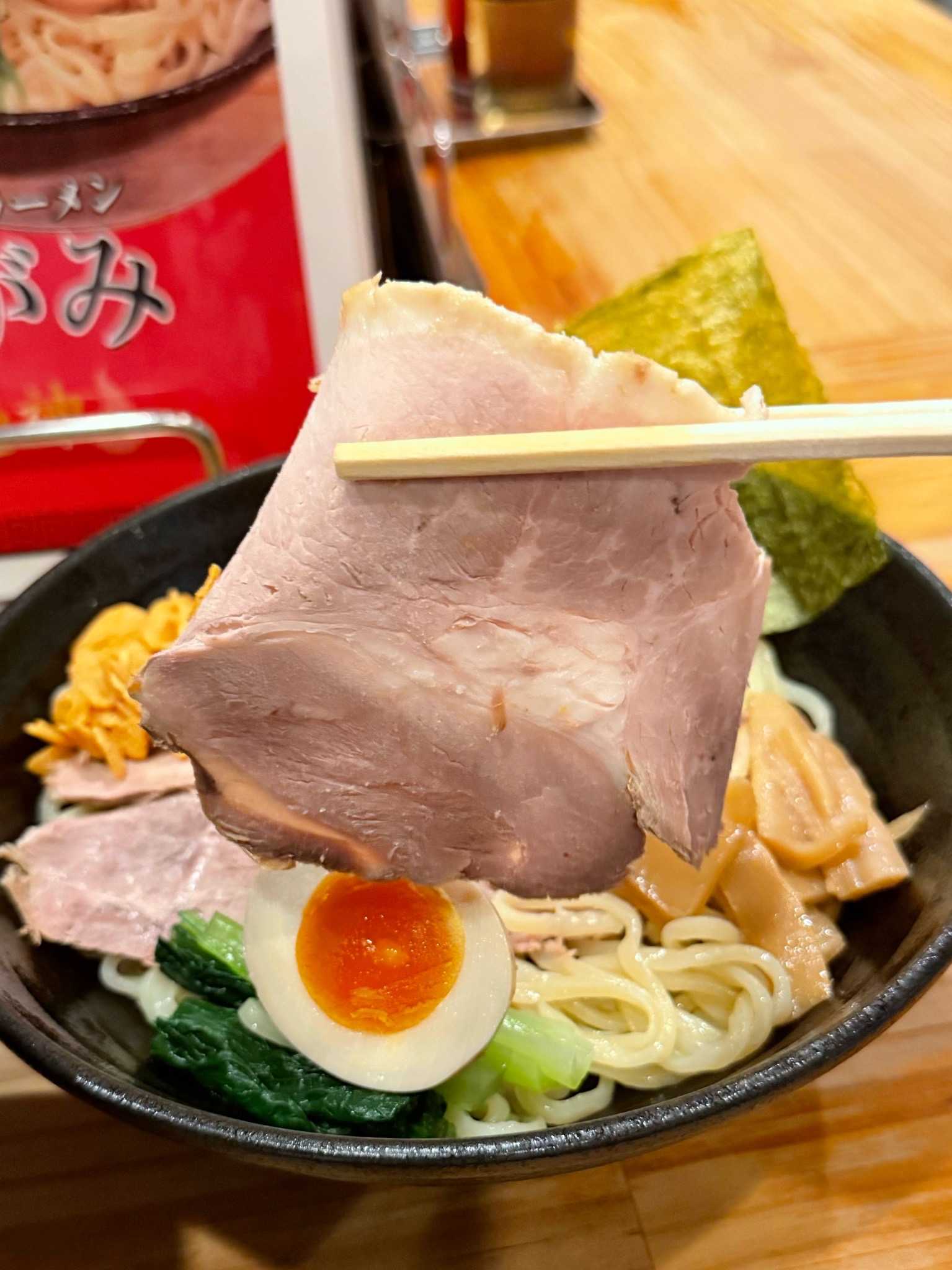 ニンニクチップがナイスアクセントで薄切りのビッグチャーシューが超インパクト
