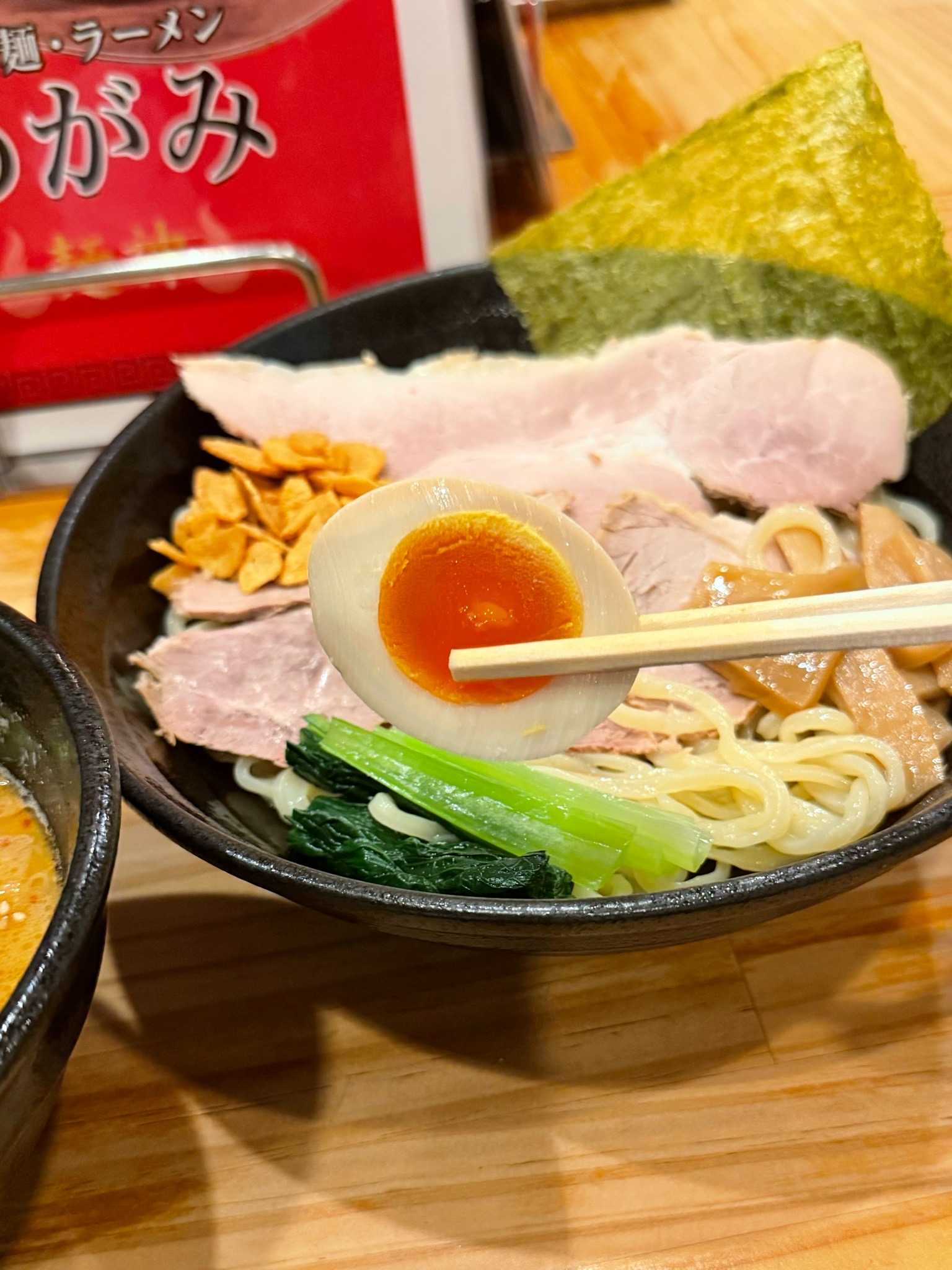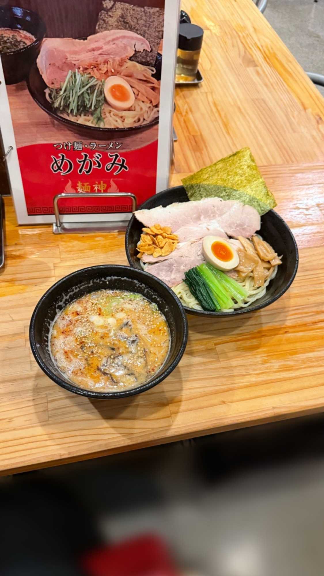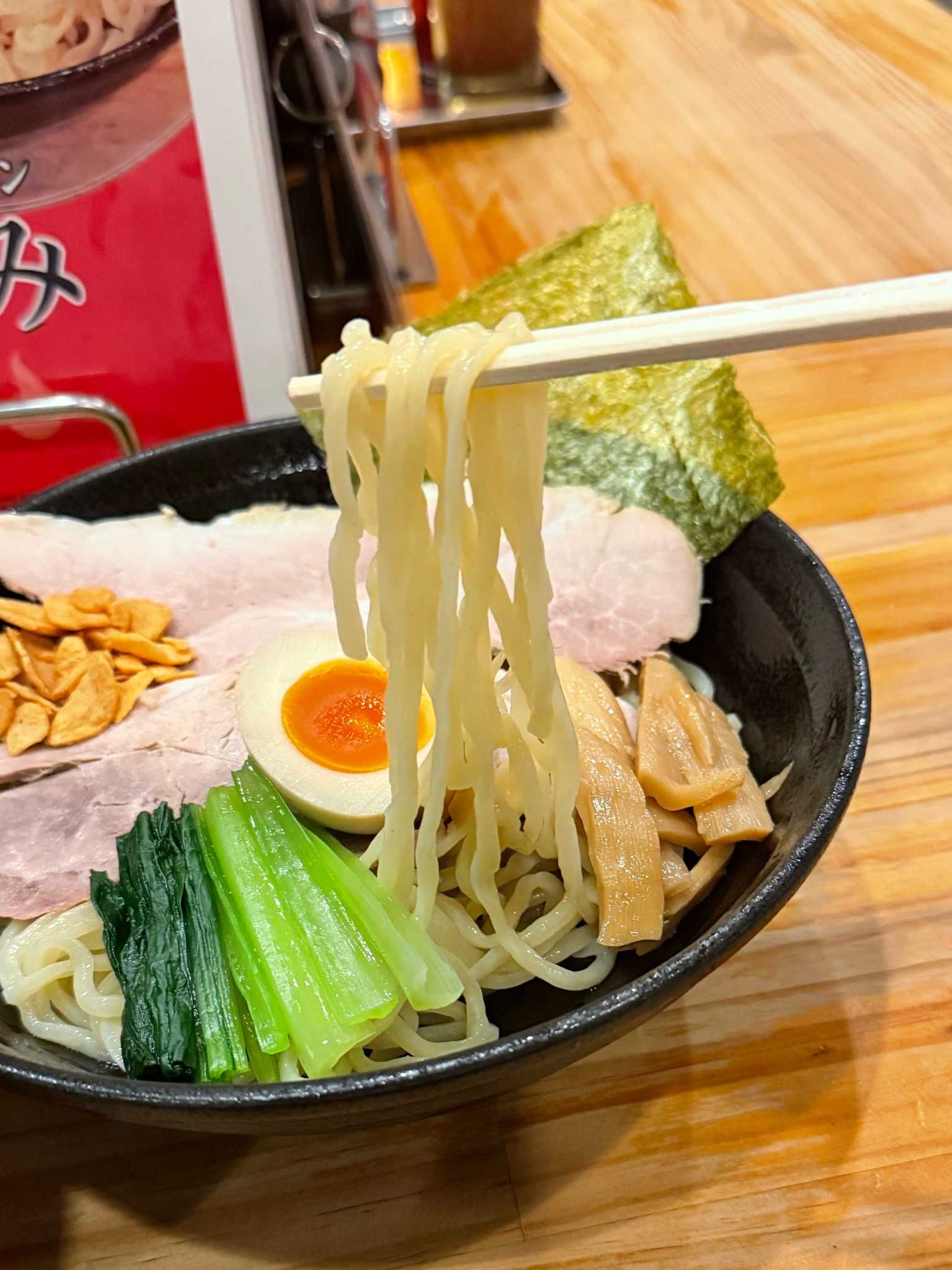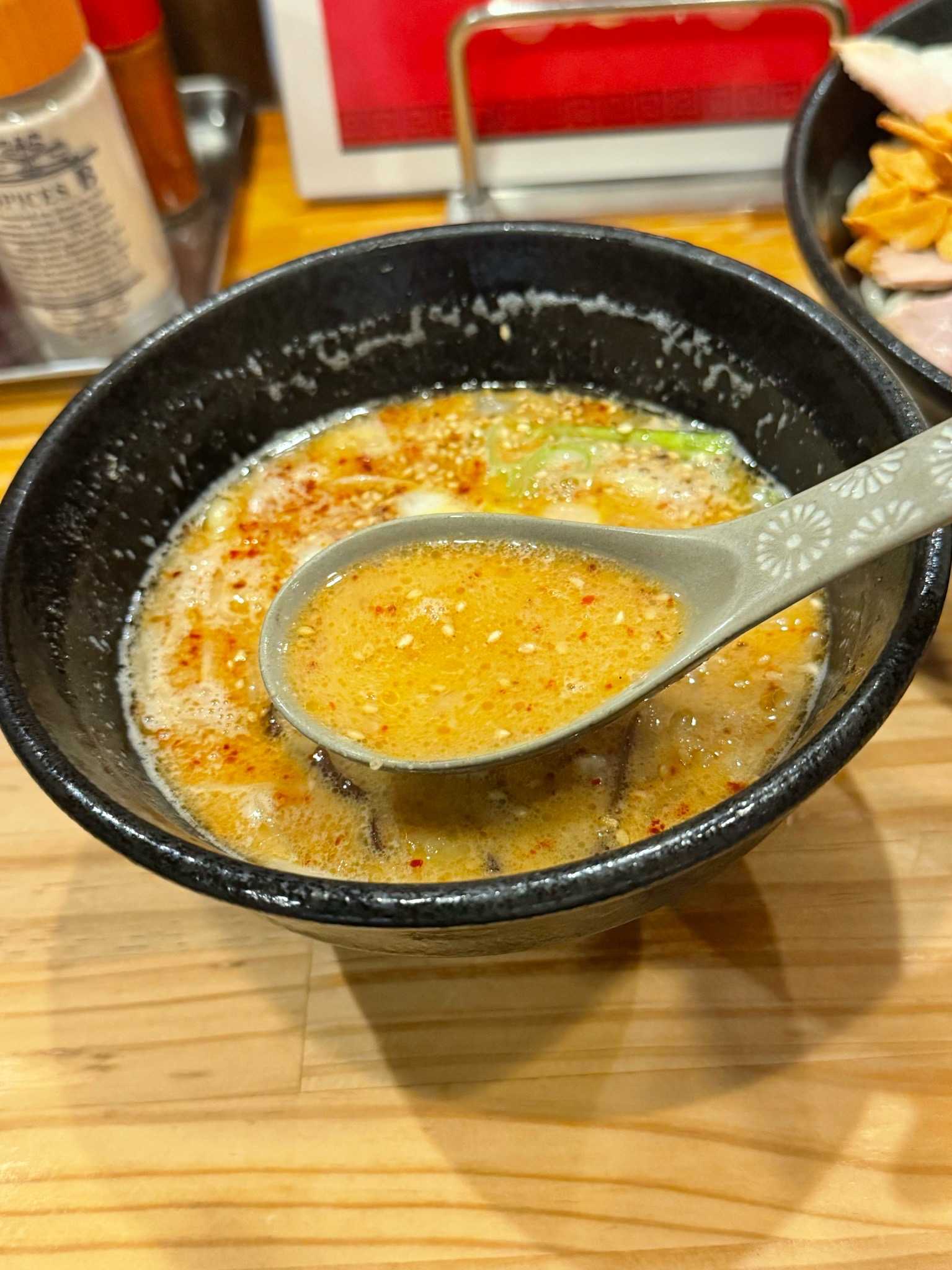 サラッとまろやかでウマみと程良く酸味のきいたピリ辛の魚介豚骨つけ汁