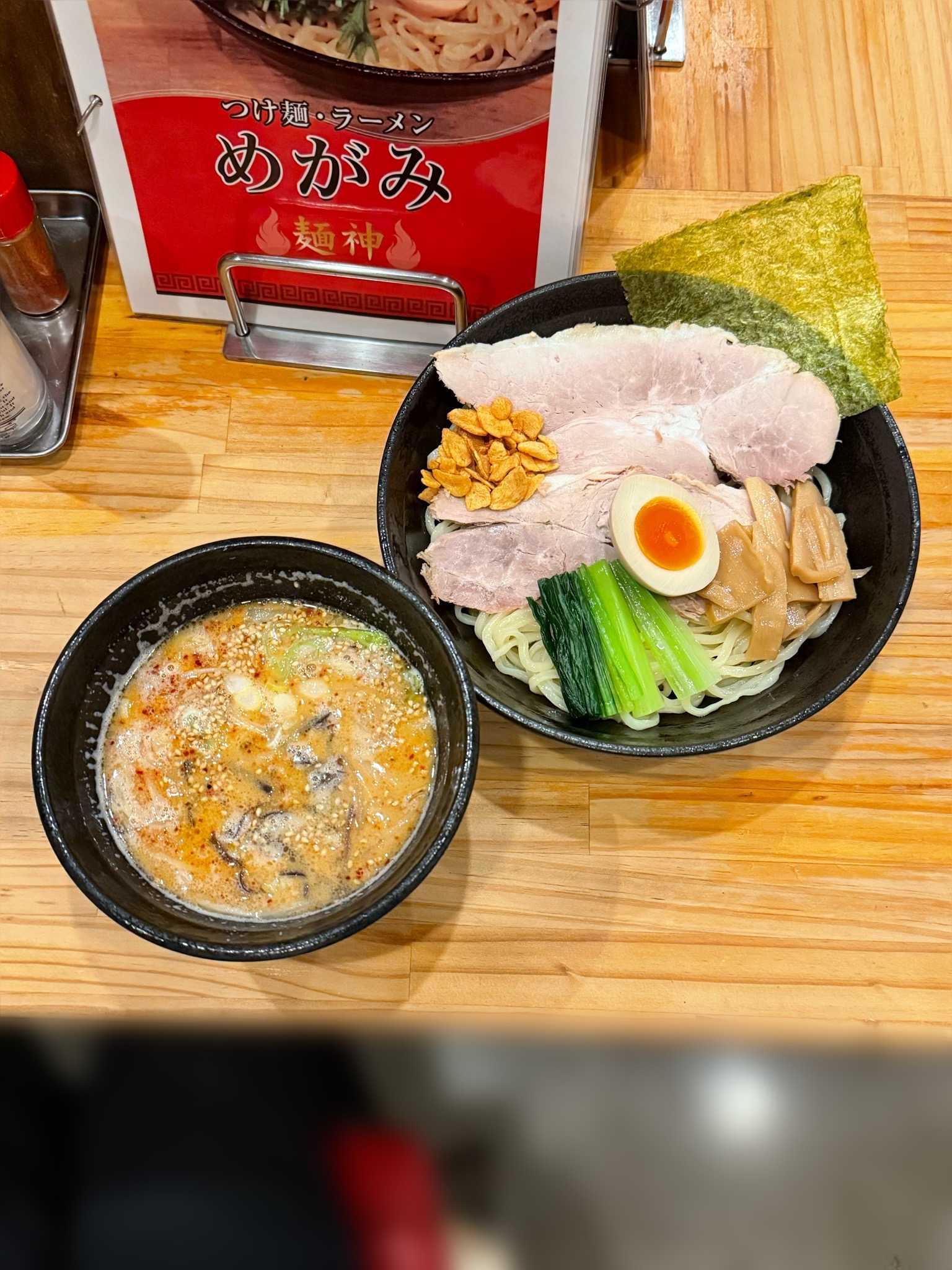 つけ麺・ラーメン 麺神|函館市※訪問回数 3回大門めがみ復刻つけ麺 並盛[1180円]サラッとまろやかでウマみと程良く酸味のきいたピリ辛の魚介豚骨つけ汁ツルモチでゆるくちぢれた太い波動麺・冷やもりつけ汁の具材はゴマ、ネギ、もやし、にんじん、キャベツ、キクラゲ麺には海苔、メンマ、小松菜、ハーフ味玉がトッピングニンニクチップがナイスアクセントで薄切りのビッグチャーシューが超インパクト具材豊富で食べ応えのあるつけ麺【UMSR】🍜つけ麺・ラーメン 麺神📍函館市本通2-34-9🈺11:00〜15:00/17:00〜21:00 定休日[木]🅿️店前3台、店横6台