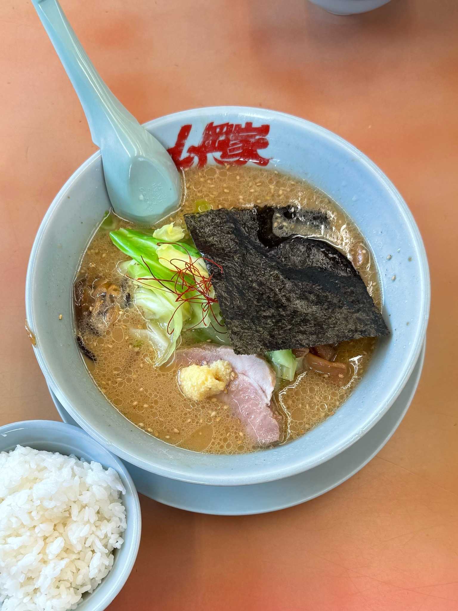 ラーメン山岡家 月寒店|札幌市豊平区※訪問回数 初濃厚白みそとんこつラーメンカタめ・コイめ半ライスセット[1100円]※期間限定濃厚マイルドでコク深い豚骨味噌スープムッチリとしてコシのある平打ち気味の中太ちぢれ麺トッピングは糸唐辛子、海苔、ザクザクキャベツ、コリコリキなクラゲの佃煮、チャーシューおろし生姜が爽やかなアクセント【UMSR】🍜ラーメン山岡家 月寒店📍札幌市豊平区月寒東1条15-9-25🈺24h🚫定休日[不定休]🅿️40台