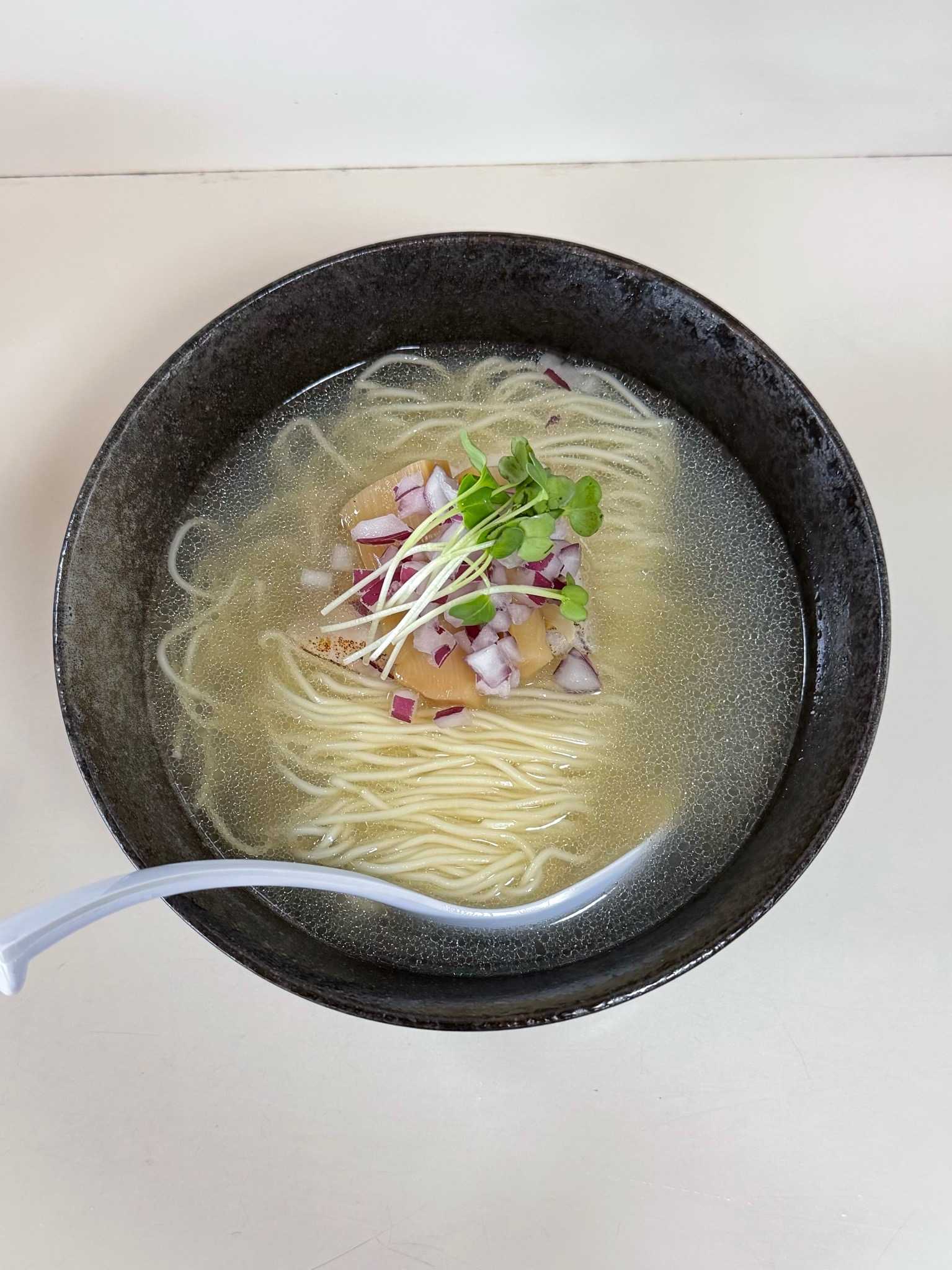 貝出汁らぁ麺 まえ川|函館市※訪問回数 3回貝出汁豚骨らぁ麺 塩[980円]豚骨のコッテリ感と貝出汁のウマみきいた濃厚白湯塩スープツルムチでコシのある平打ちの中細ストレート麺トッピングはネギ、タマネギのみじん切り、タケノコ、チャーシュー2種類まろやかさが広がる貝出汁豚骨ラーメン【UMSR】🍜貝出汁らぁ麺 まえ川📍函館市白鳥町14-13🈺11:30〜14:30/17:30〜20:30🚫定休日[月]🅿️店横2台、店裏3台