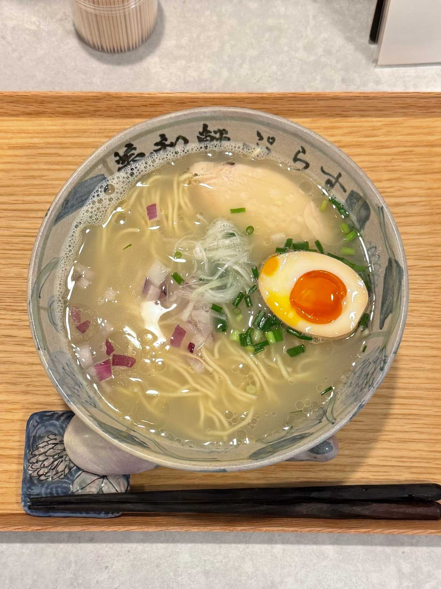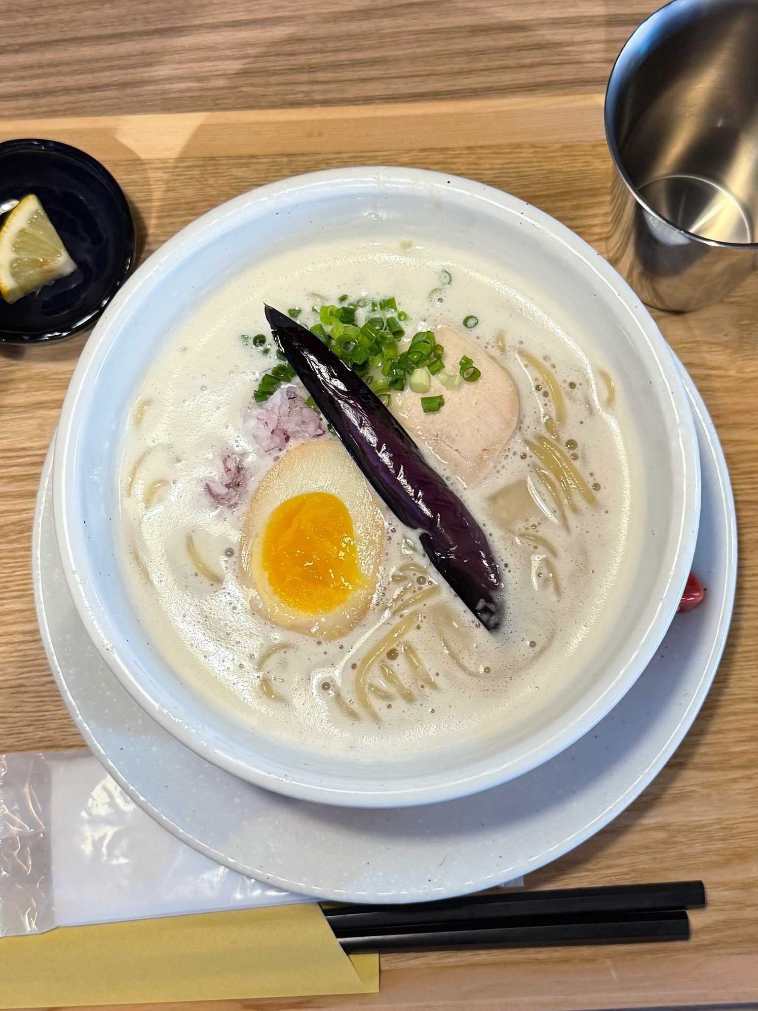 鶏白湯ラーメン 白鶏舎 北1条店|札幌市中央区※訪問回数 初鶏白湯[950円]きめ細かな泡に覆われたコクうまクリーミーな鶏白湯の塩スーププリムチの中太ストレート麺トッピングは青ネギ、みじん切りの紫タマネギ、揚げナス、ハーフの半熟味玉、鶏チャーシューカットレモンや卓上のリンゴ酢でさっぱり感アップ🍜鶏白湯ラーメン 白鶏舎📍札幌市中央区北1条西3-3-11 桂和北1条ビル 2F ※地下鉄大通駅から徒歩約5分🈺11:00〜14:30L.o 定休日[不定休]🅿️無