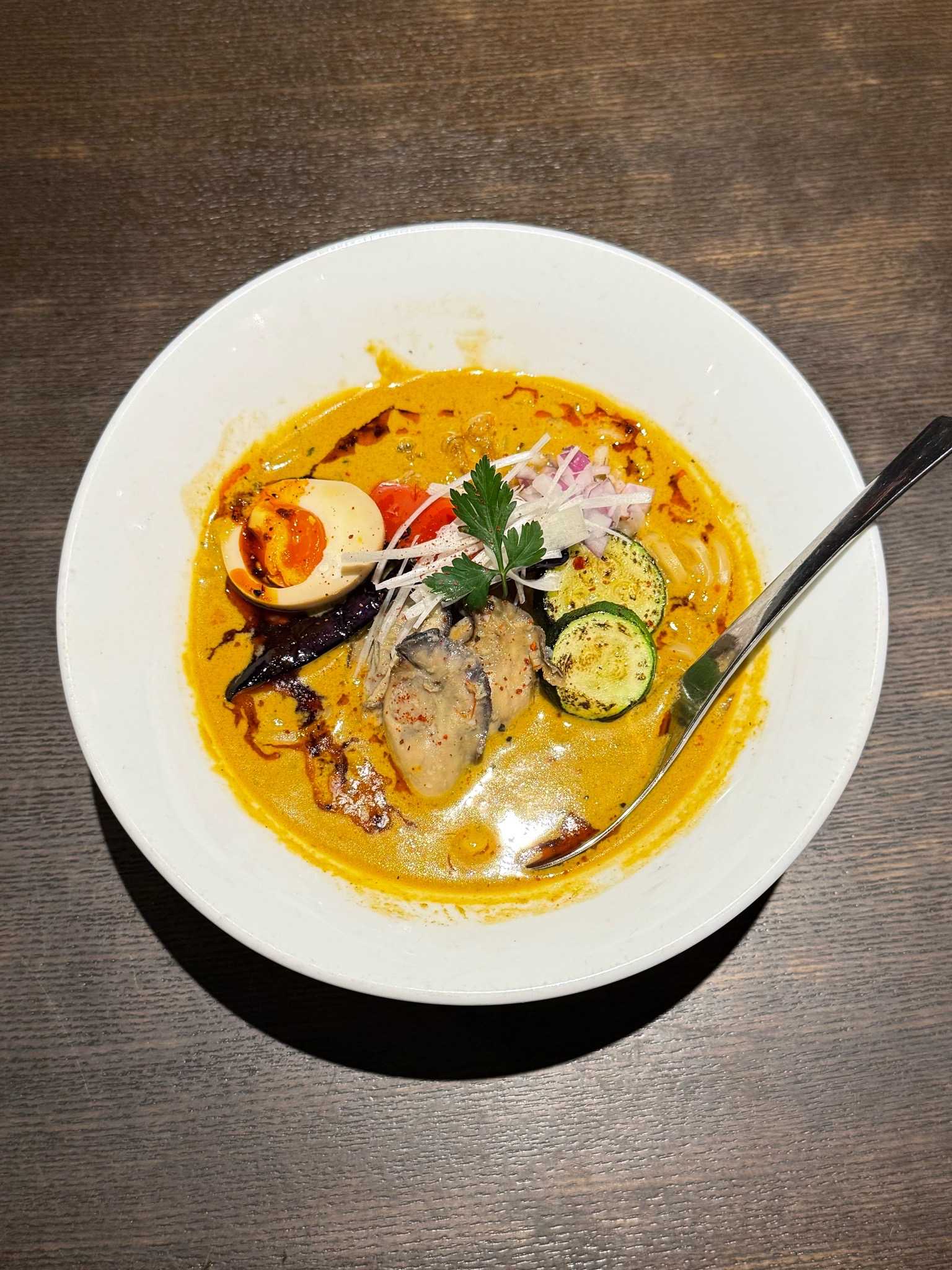 スープカレー しゃば蔵|札幌市中央区※訪問回数 15回牡蠣のレッドカレーラーメン [1250円]※期間限定牡蠣のエキス全開で濃厚クリーミーなピリ辛スパイシースープツルモチでゆるいウェーブの平打ち気味の中太麺具材は白髪ネギ、パクチー、刻みタマネギ、ナス、ズッキーニ、えのきの唐揚げ、味玉ハーフ、ウマみが凝縮されたプリプリの牡蠣別の器に入った特製ラー油で辛味を調整リピートしたくなる牡蠣のレッドカレーラーメン【UMSR】🍜スープカレー しゃば蔵📍札幌市中央区北1条西4-2-2 札幌ノースプラザビル B1 ※地下鉄大通駅から徒歩で約3分🈺11:30〜14:30/17:00〜21:00L.o🚫定休日[日祝]🅿️無
