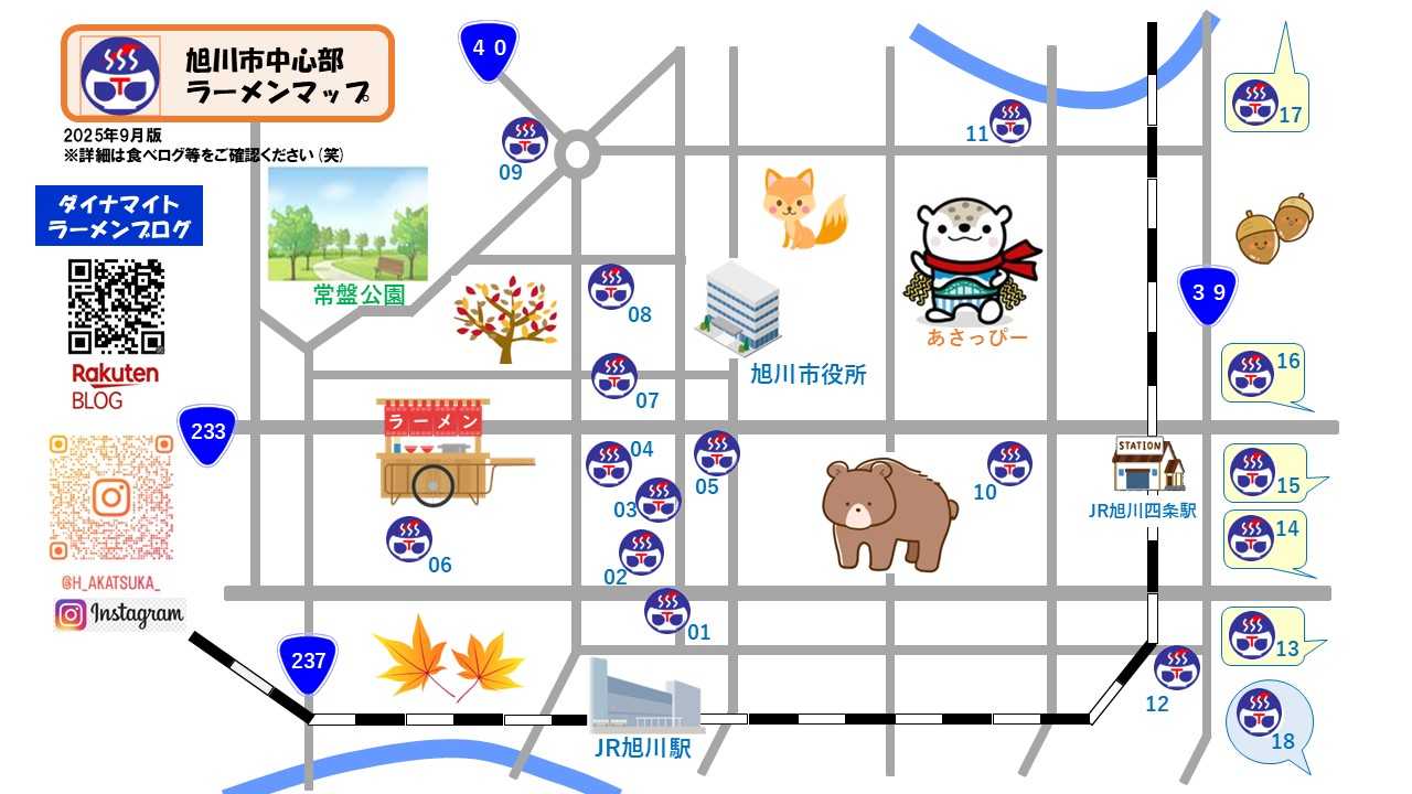 ※メニュー・価格等は投稿当時の情報となりますのでご注意ください※古い情報が多いため最新情報は食べログ・SNS等でご確認ください01:山頭火 旭川本店 02:梅光軒 旭川本店 03:青葉 本店 04:味特 本店 05:天金 四条店 06:黄拉拉 07:蜂屋五条創業店 08:すがわら 本店 09:みづの 10:蜂屋 旭川本店 11:宝龍 12:鷹の爪 宮前店 13:まよさわ 14:よし乃 本店 15:RAMEN FRESNO 16:三日月 17:ひまわり 18:ajito