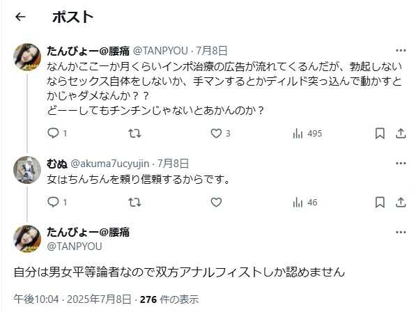 この記事は下ネタありです。一応カテゴリーは事務所とさせていただきます。教材として利用します。(概念の発明です)Xのコピペでこのような会話のやりとりがありました。 >たんぴょー@腰痛@TANPYOU·7月8日なんかここ一か月くらいインポ治療の広告が流れてくるんだが、勃●しないならセッ●ス自体をしないか、手●●するとか●ィルド突っ込んで動かすとかじゃダメなんか??どーーしてもチ●チ●じゃないとあかんのか? >むぬ@akuma7ucyujin·7月8日女は●ん●んを頼り信頼するからです。 >たんぴょー@腰痛@TANPYOU自分は男女平等論者なので双方ア●ルフィストしか認めません(゜-゜)このやりとり こんな下ネタを糞真面目に思想する。この話し合いがかなり自分にとっては気になる話し合いです。ア●ルだけにクソ真面目>むぬ@akuma7ucyujinちょっと時間がかかりましたが~RPうーん、頭の回転がもっと早ければポストも速くRPで来たと思うのですが、今更ながらこれは「挿入優位論」に基づくと考えられます。「引用たんぴょー@腰痛@TANPYOU·7月8日返信先: @akuma7ucyujinさん自分は男女平等論者なので双方ア●ルフィストしか認めません午後7:23 · 2025年7月22日」·556 件の表示むぬ@akuma7ucyujin7月24日「挿入優位論」の逆は「受容優位論」と呼ぶこの話し合いは「概念論」基本的に下ネタの要素がありますがなんとなくある。意識を概念化し命名した瞬間です。空気の存在に気づかず、空気を吸っていたとして「空気」の存在に気づき始めて概念となる。リンゴが落ちるのは、ただ当たり前から「地面」が「物」を(引っ張る力)があると観念化した。これを「万有引力」と呼ぶ。ここでいう「挿入優位論」とは男女が合意の上で行為に及んだ筈なのに18禁表現などで何故か(大変不適切な言葉ですが)「OKASU」丘巣という言葉が用いられることがしばしば見られます。これはとても奇妙です。入れた方が勝ちと考える、18禁漫画、ビデオなどでありがちな 挿入優位論「そうにゅうゆういろん」その逆が「受容優位論」受け入れる「吸収する側」が男を支配していると考える、オネショタなど「受容優位論」(じゅようゆういろん)これは観念の発明なのであとで教材にしようと思います。吾輩は少数派の「受容優位論者」なので会話に、う?となって考えてしまった。