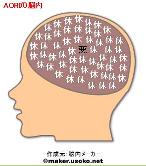 脳内メーカーって知ってますか? 今、流行してるってTVでやってました。何でも名前を入力するだけで、その人の頭の中がわかってしまうらしいです。(もちろんお遊び)好奇心旺盛なAORIは早速挑戦してみました。 名前の所に<AORI>と入力。診断開始! 診断結果 ・・・・うーん確かに疲れているけど、脳はすごく休みたがっているみたい・・。(頭の真ん中の悪ってなんだろう・・・・) 次に、AORIの本名を入力して診断開始! ・・・・嘘と休むという文字に挟まれて<H>という文字が!?AORIは、Hという事でしょうか??? 皆さんも暇があったら遊んでみてください^^(すっごく重いサイトです)脳内メーカー http://maker.usoko.net/nounai/