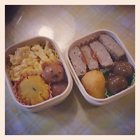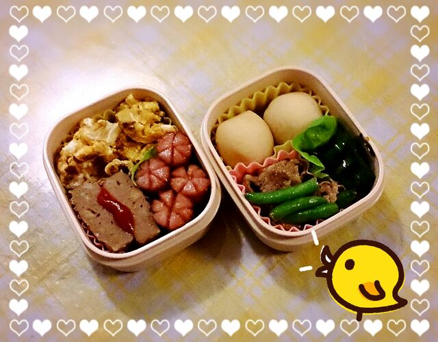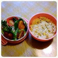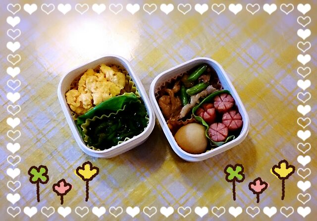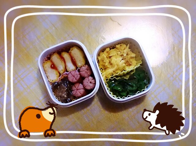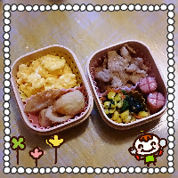 本日も昨日と同じ時間に登校のJK。 寒稽古で何するかというと男子は剣道(多分) 女子はグラウンドをマラソン。 1時間続けるそうです。 一年生だけとか。 遠方から通学している子は始発もまだ動いてないような時間に 出てこなきゃいけないわけですが、親に送ってもらうか、 同じ方向からくる子のところに同乗させてもらえないか、 どうしても無理な時は遅刻も可とか、 親が送るの前提かよ!って感じの行事です。 今日のお弁当は二つ。 menu ・スクランブルエッグ ・ちくわの煮物 ・豚肉生姜焼き ・ほうれん草とコーンのバター炒め ・ウインナー 昨日から写真についているスタンプは kfstudioさんのLINE用スタンプ素材を使わせていただいています。