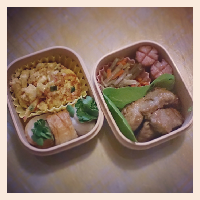 今日はお弁当一つです。 menu ・醤油バター味焼き野菜 ・カニクリームコロッケ ・ミニフランク ・梅おろしチキンカツ ・ちくわのカイワレ巻き巻き ・サラダ菜 ・チャーハン