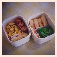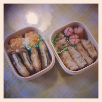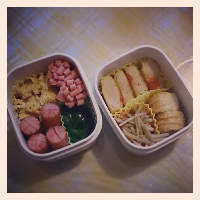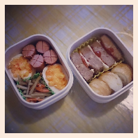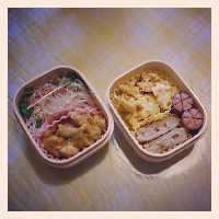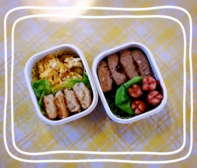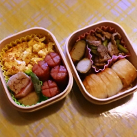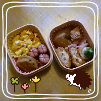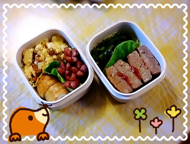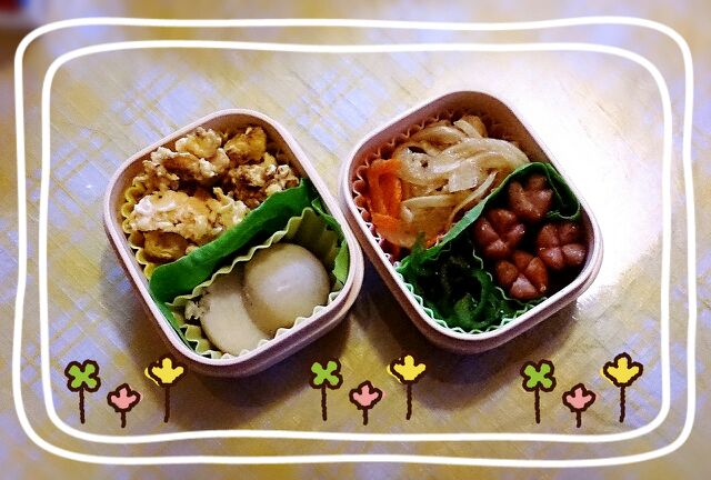 今朝は起きて外を見たら霧で真っ白でした 今日のお弁当は二つ。 menu ・スクランブルエッグ ・がんもの煮物 ・ウインナー ・大根と鶏肉の煮物 ・白身魚タルタルフライ ・ちくわのカイワレ巻き巻き なんか地味弁