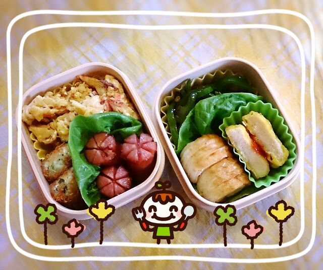 超久々 さぼりすぎやん。 そう変わり映えするメニューでもないですが。 menu ・かにかま入りスクランブルエッグ ・ほうれん草とチーズのささみかつ ・ウインナー ・ピーマン炒め ・ちくわのチーズまきまき ・チキンナゲット ・サラダ菜